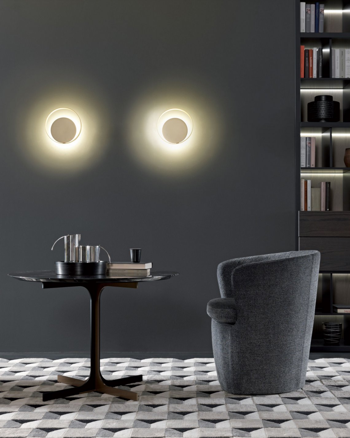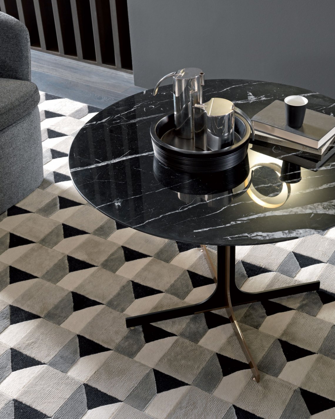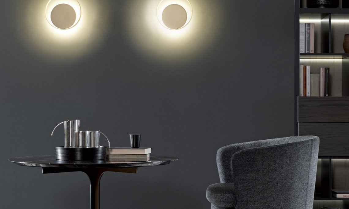 圓形頂部的兩個雙C形金屬支腳, 標志性的風格與出色的功能性能相結合,使Janus Lounge適合休閑區中的徹底放松。