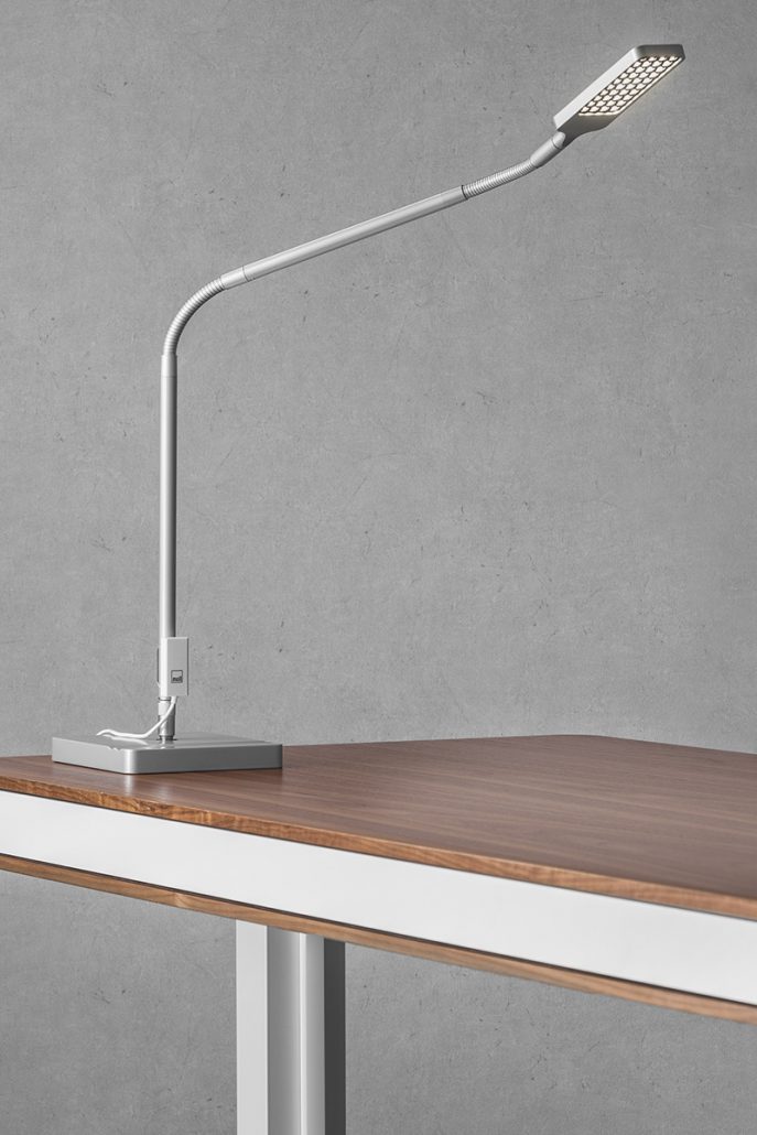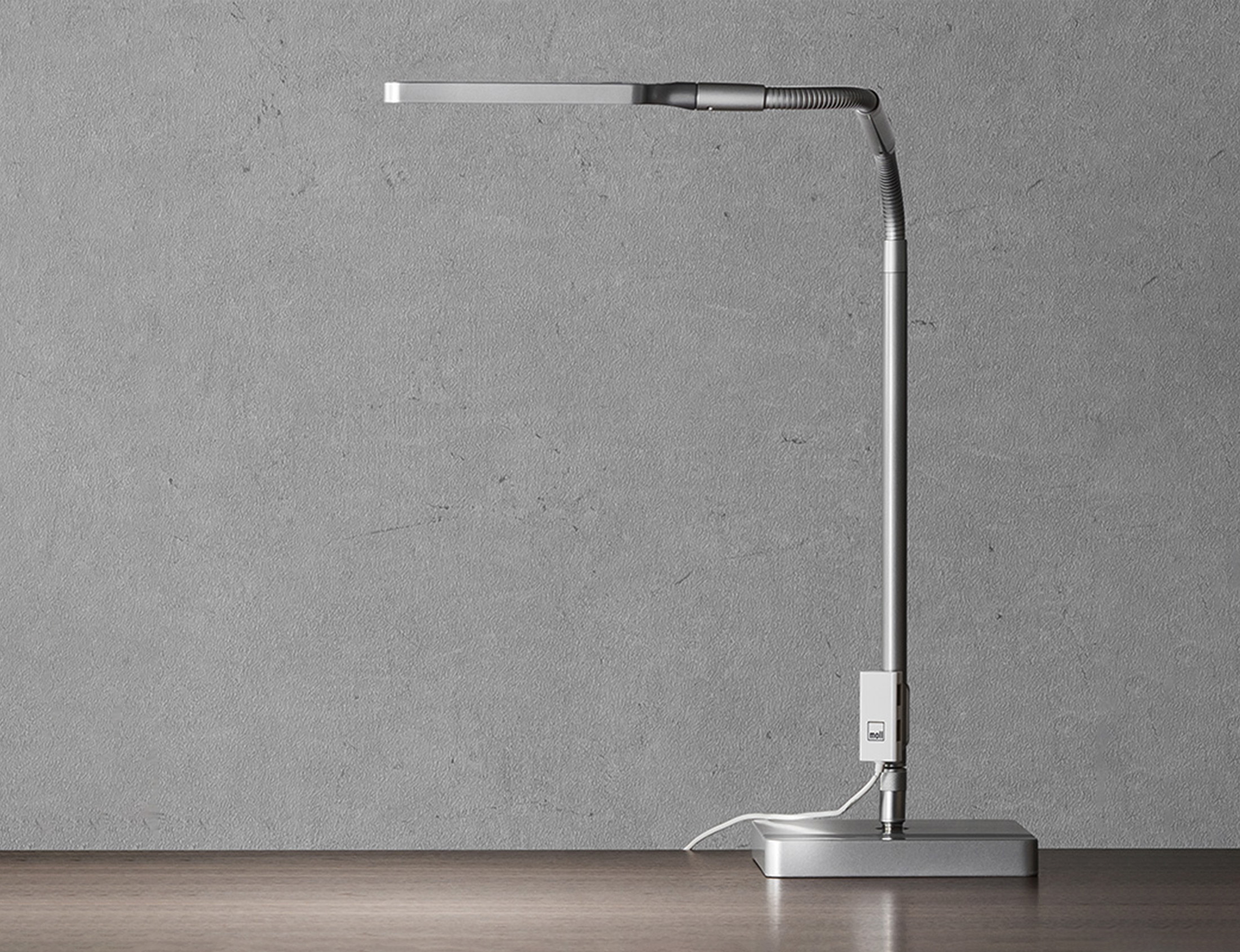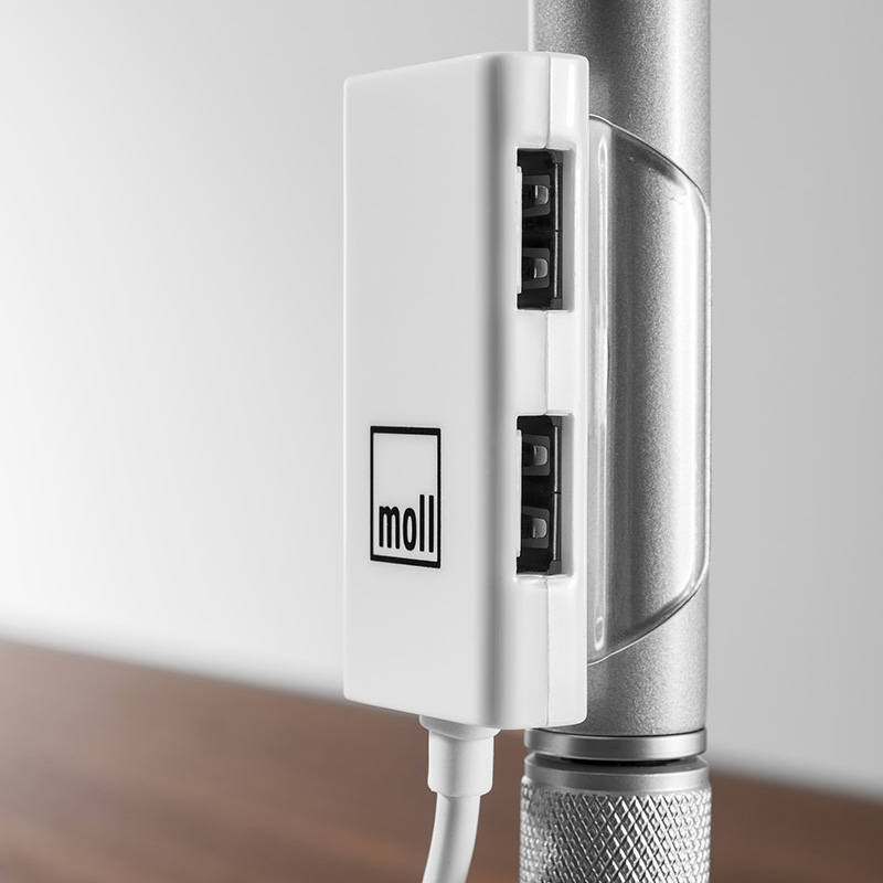 Minimalist design, LED technology, high flexibility and a dimmable comfort light: The designer lamp moll L7 lamp ensures optimal illumination of the work space. A USB port at the foot of the lamp serves as a practical loading station and adapts the moll L7 to the growing technical demands of the modern private office.