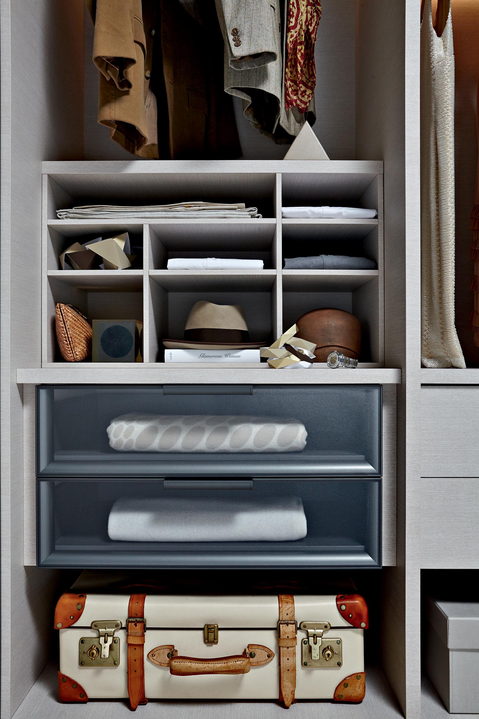 帶有襯衫和毛衣固定架的網(wǎng)格,懸掛式抽屜單元,帶有錫合金色框的透明玻璃前面板。