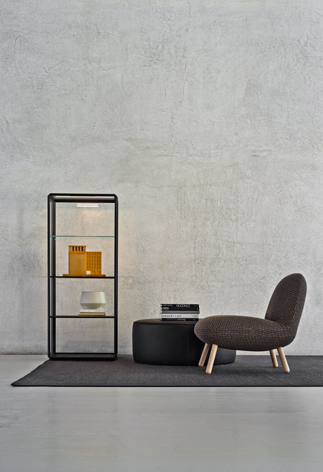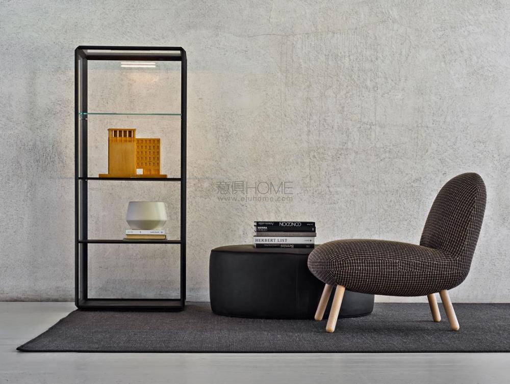 一個設(shè)計用來展示和儲藏珍貴物品和書籍的展示柜。呈現(xiàn)出一個透明的固體形狀,引人注目。通過層板的旋轉(zhuǎn)和傾斜,從傳統(tǒng)的90°角平滑過渡到45°邊角處理。幾何旋轉(zhuǎn)表面創(chuàng)造了45°平滑的邊緣,通過獨創(chuàng)的金屬連接件固定鋁制邊框,并用珍貴木皮包裹。開門裝置則完全隱藏,只露出一把側(cè)面邊框上的小鑰匙。