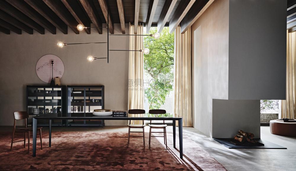 由Rodolfo Dordoni設計的Filigree桌, 特點是由壓鑄鋁制成的彎曲桌腿以及輕薄支撐,結構上采用了新的錫金屬裝飾,頂部則是光亮的桉木。