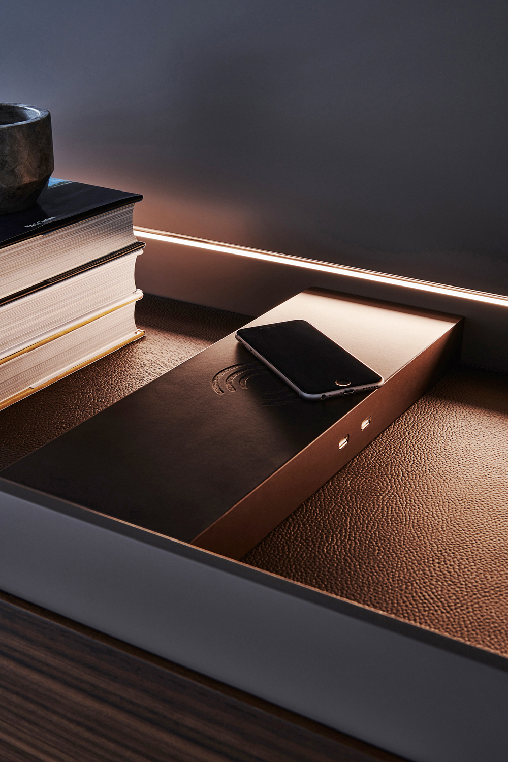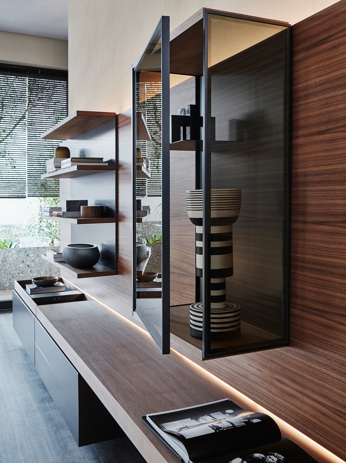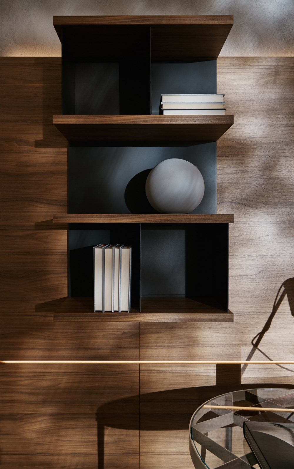 4.The compositional system is open-ended and can be expanded by using different finishes, to be mixed and matched at will. The choice of woods has been extended, beyond Eucalyptus and Graphite Oak, to include the noble Walnut. The finishes of the matt and glossy lacquers now include Copper, Pewter and Dove Grey. The bookcases can be enriched, on request, with bonded hide leather divisions.
