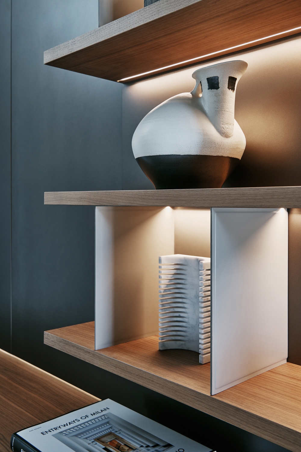 3.As in a crossword, hooked to the boiserie, the wall at the bottom part can be accessorized with containers, either hanging or on the floor and fitted with thick shelves or with trays lined at the bottom with Ecoskin. Grid’s compositional freedom is further extended at the top by open bookshelves, display units of varying heights, with either Pewter or Copper metallic finishes, for precious ornaments, pictures or mementos.