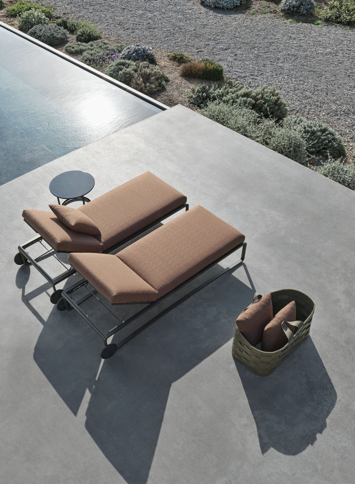 Practical, lightweight and easily movable baskets for towels or magazines are designed to create order and embellish outdoor spaces.