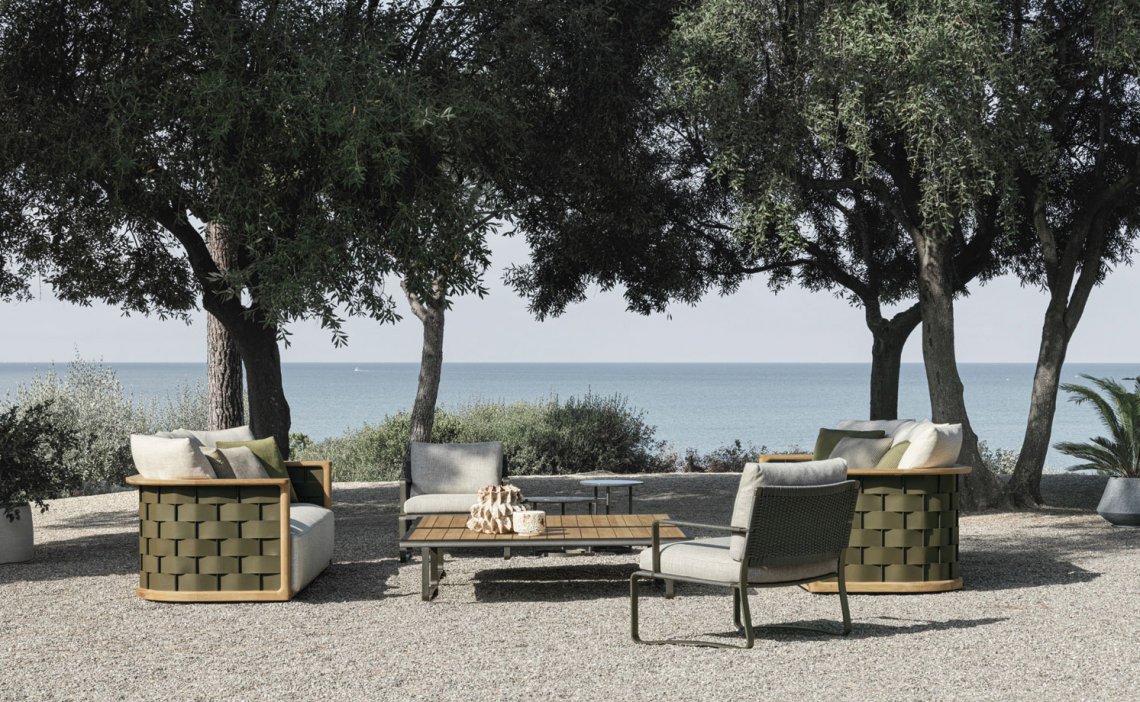 Both tables are available with tops in either teak slats or Etna lava stone with an enamelled finish in anthracite, olive green and desert yellow, which are common to the colours of the collection and the woven polypropylene rope. The vitreous inserts of the Etna lava stone, used for the oven-baked enamelling of the surfaces, come from the crushing of recycled glass from TV and PC monitors.