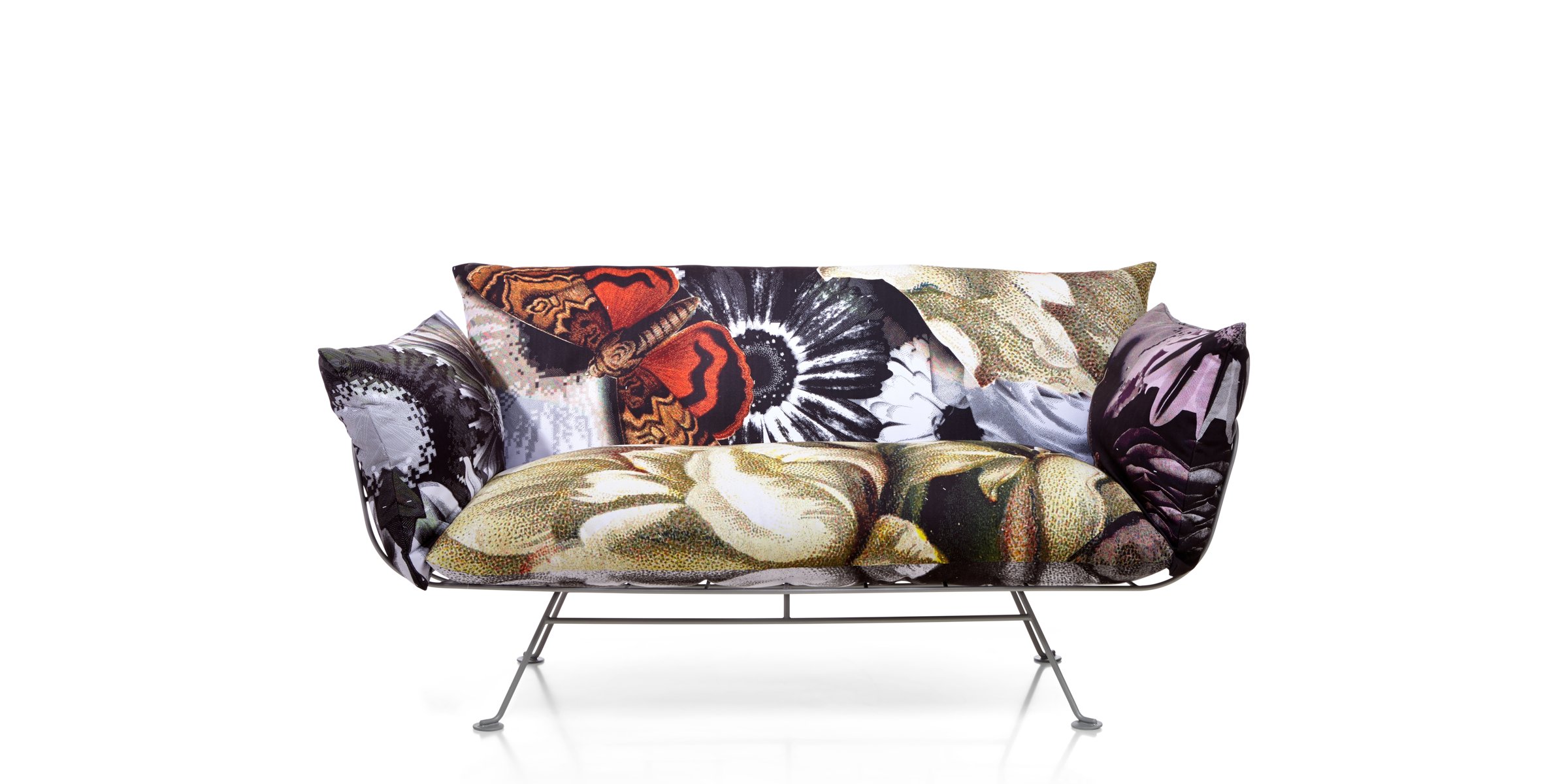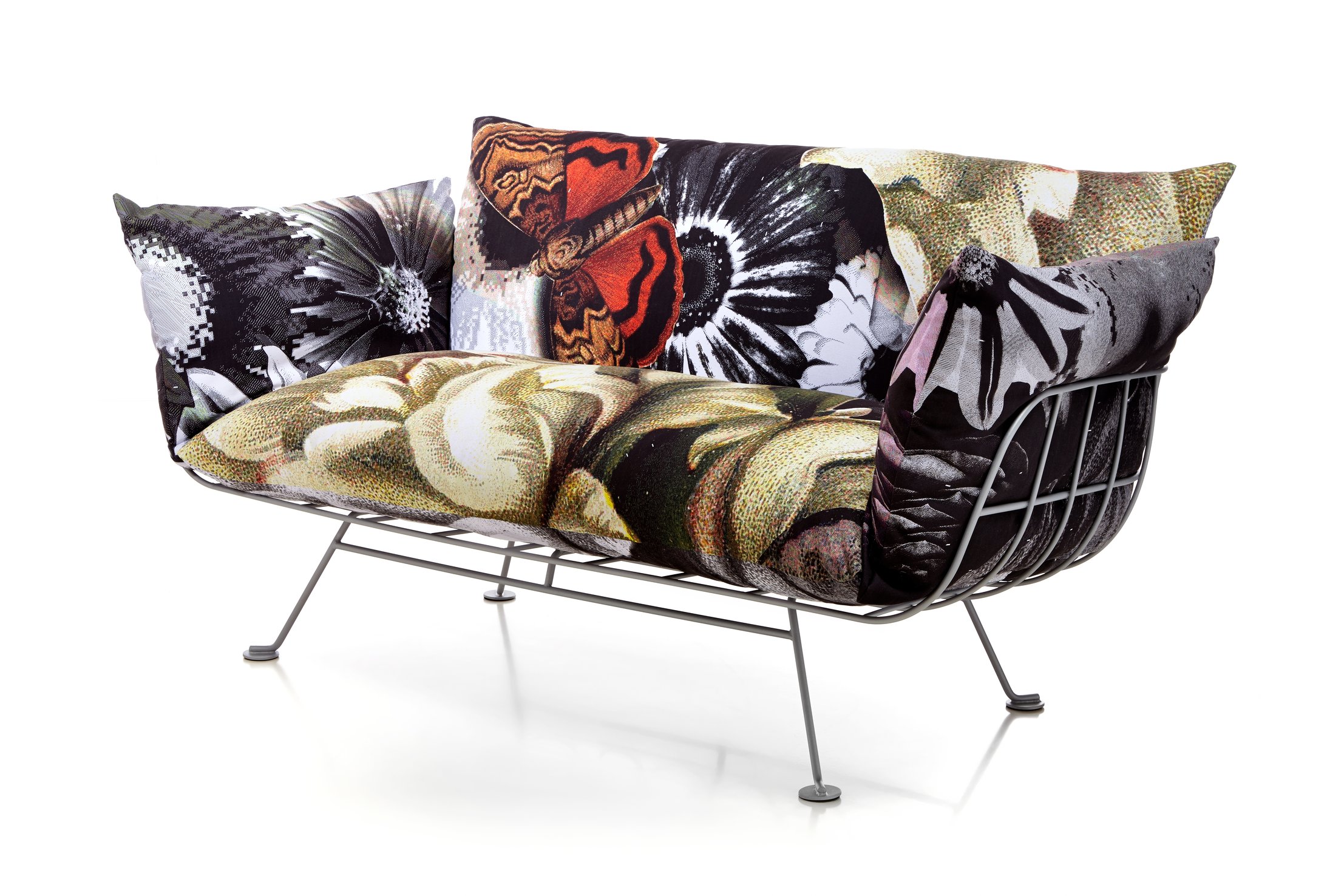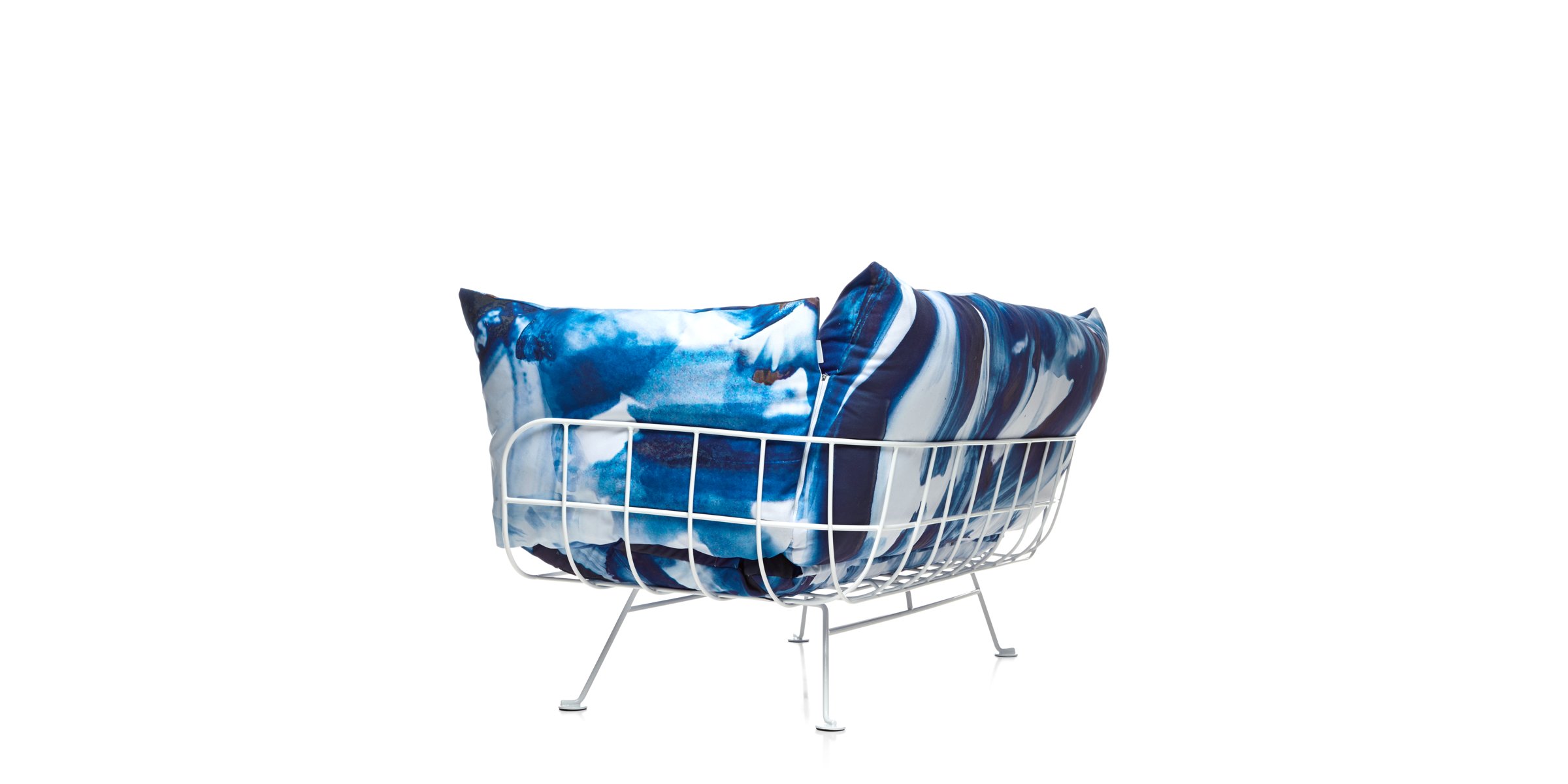 The Nest collection’s linear, clear metal structure lifts the plumpest and softest cushions from the floor. It is a comfy elevated nest for one or more people. For the lovers of fresh, colourful prints Marcel Wanders has developed two signature textiles with a heart of sunshine: ‘One minute’, with its instant splashes of blue skies, and ‘Flower bits’, with a bloom of flowers and butterflies. Since this chair and sofa are all about their cushions, they are also available other prints and colours so that everyone can accessorize their personal nest with the look that most represents them.