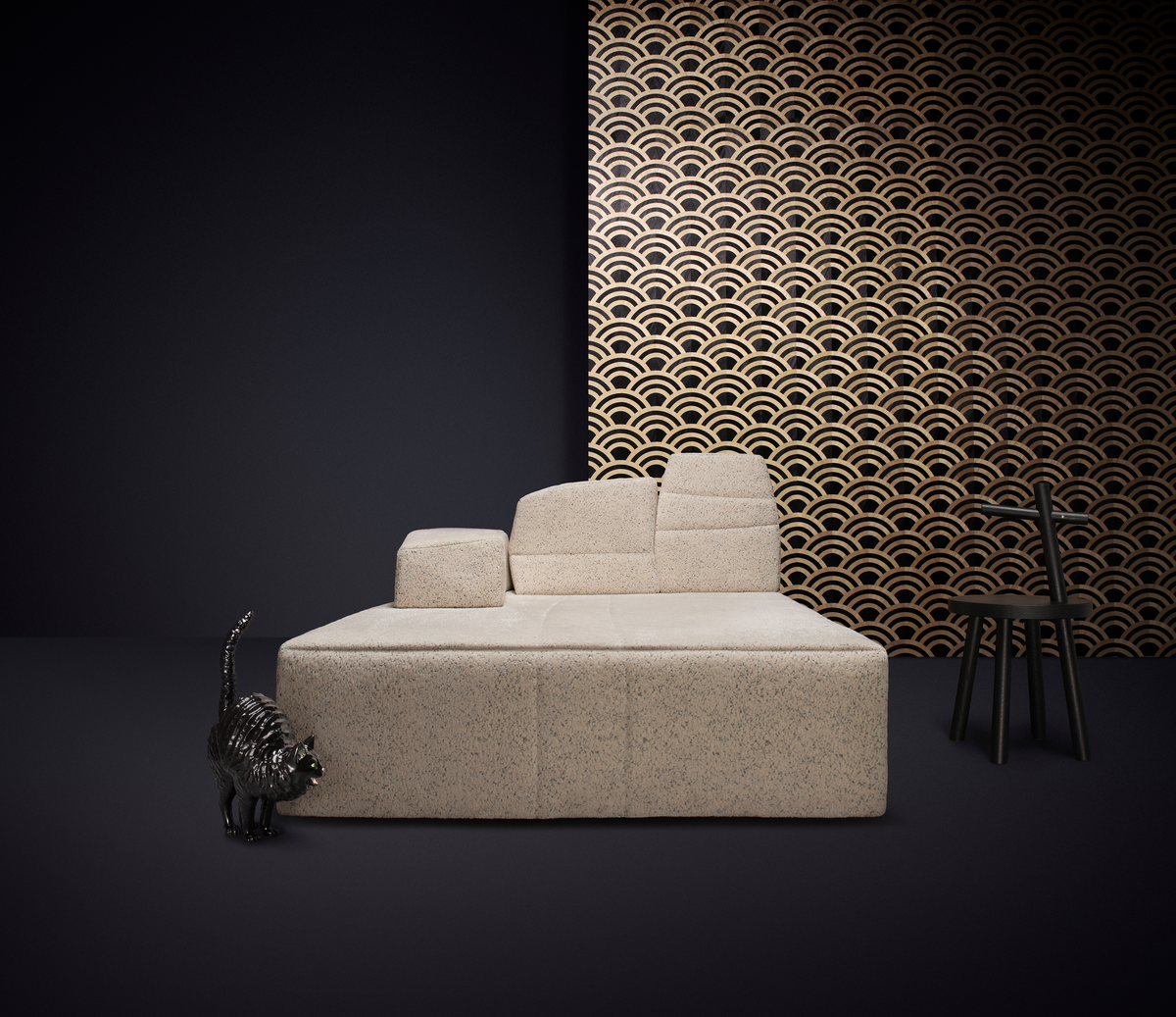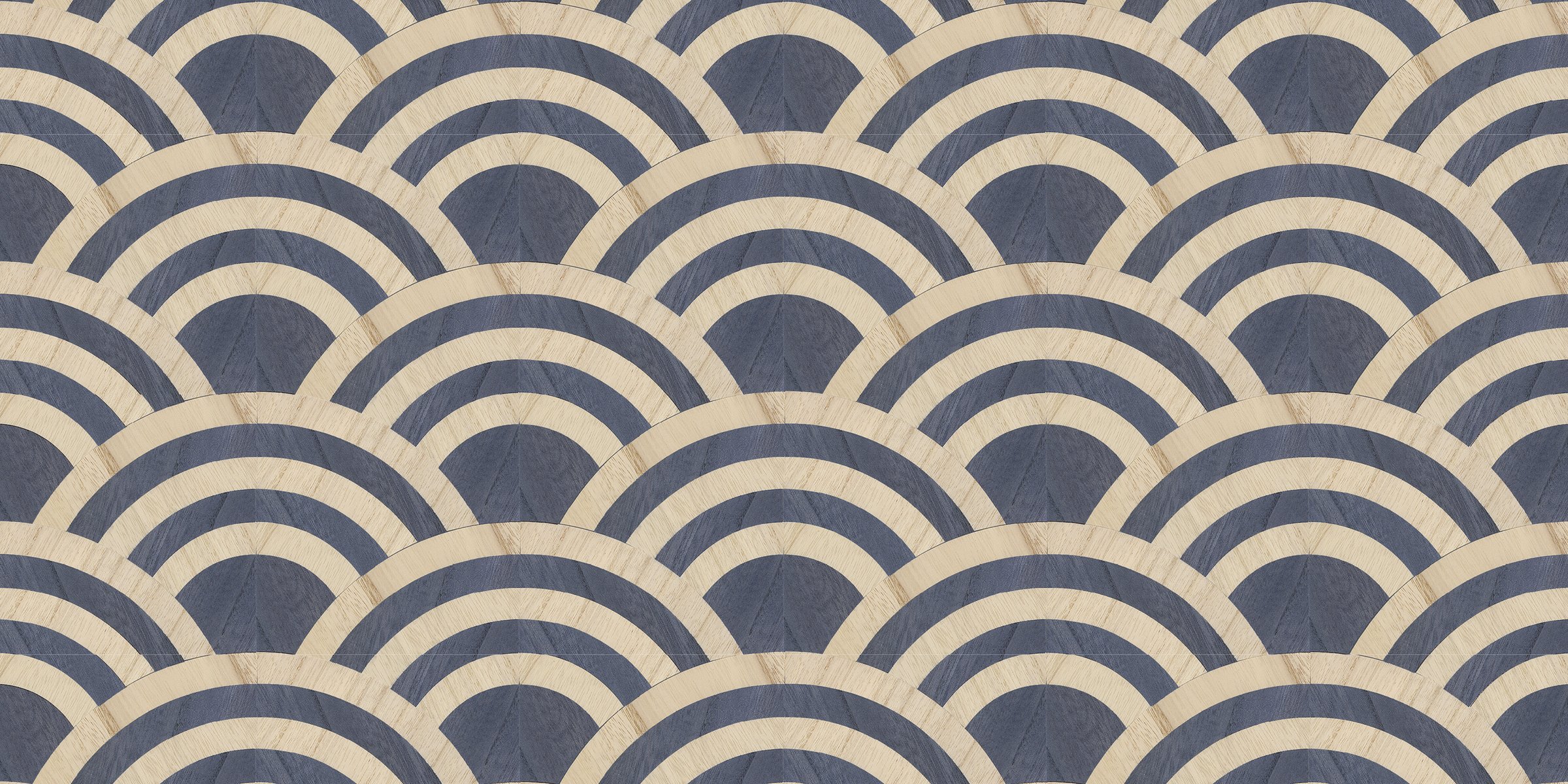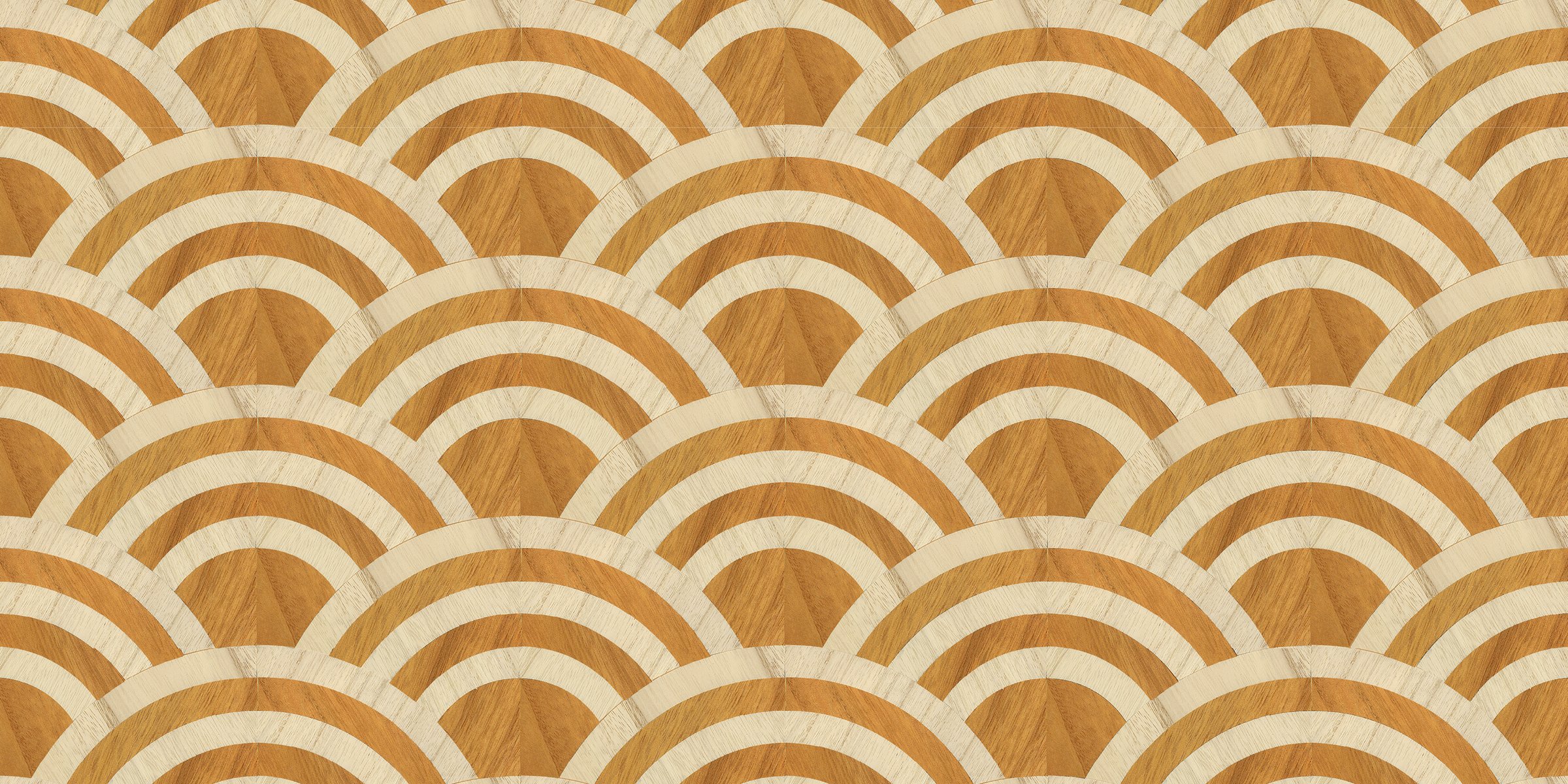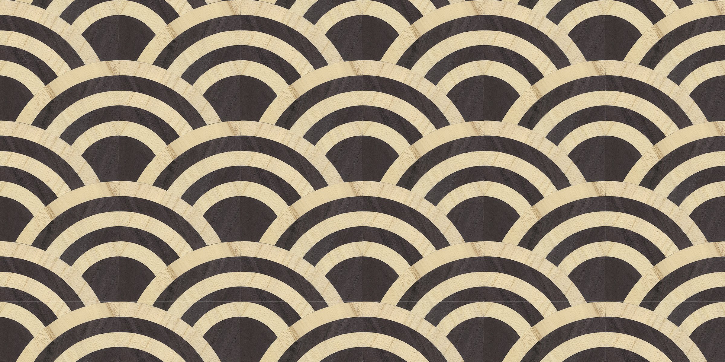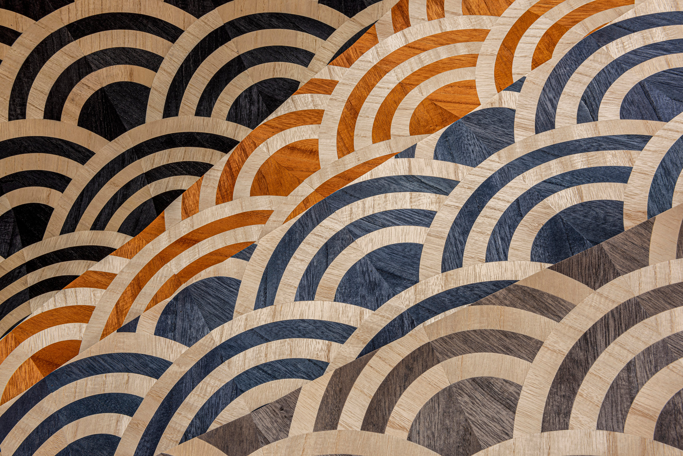 Overlapping O’s, created of wood veneer marquetry inlay, resemble the rolling waves of the ocean. The unique wallcovering’s ancient Seigaiha pattern symbolising waves of water represents good luck, power, and resilience.