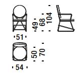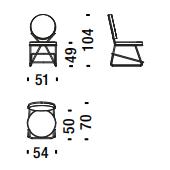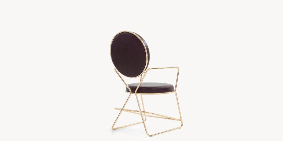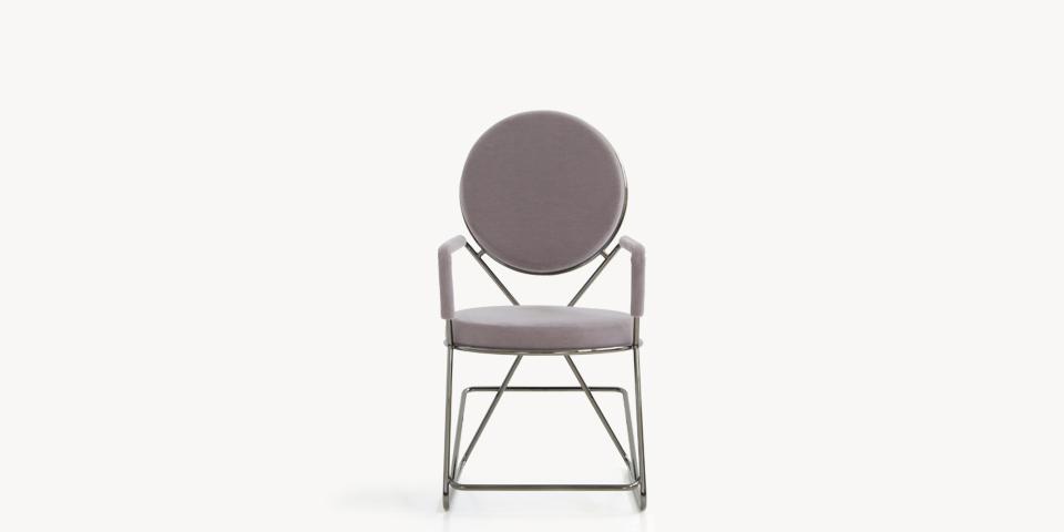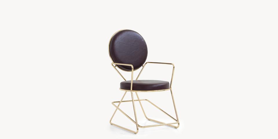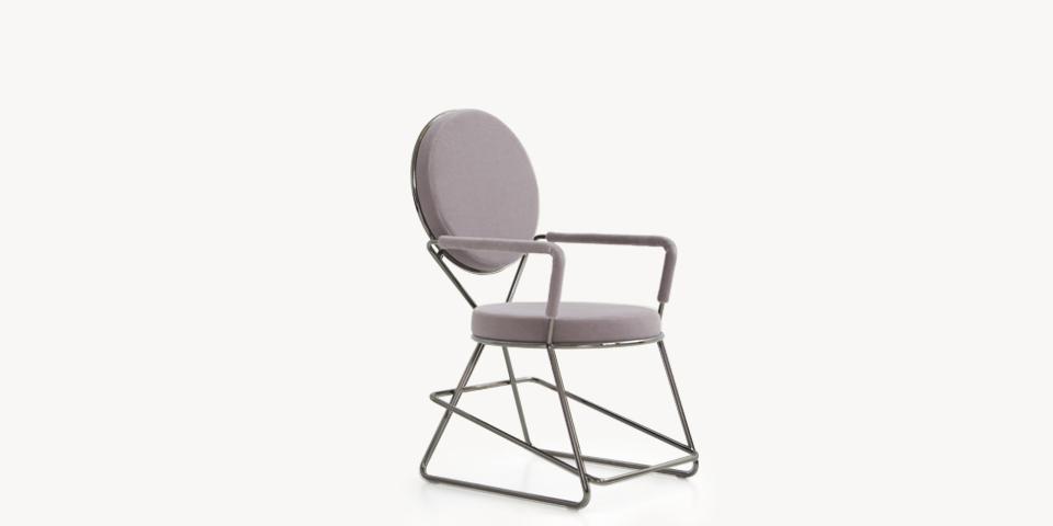 Due cerchi, due moduli elementari innestati in una geometria costruttiva di ispirazione déco, comunicano apertamente la tendenza alla massima semplificazione formale. è il preludio a una produzione industriale di altissima qualità, un’elegante economia di volumi espressa dalla possibilità, offerta dalla struttura in tubolare di acciaio cromato, di declinare il progetto in una famiglia di sedute completa. Nascono così una sedia e uno sgabello, con e senza braccioli, ai quali si aggiunge un divanetto a due posti, raffinata evoluzione formale dettata dalla classe e dal buon gusto. è un ritorno all’ordine, transizione verso un linguaggio lussuoso e sintetico insieme.