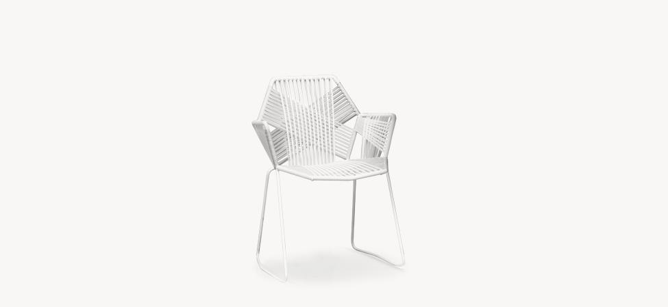 Struttura in acciaio inox o verniciato per uso esterno. Sottopiedi in PVC. Intreccio in filo tecnopolimero.