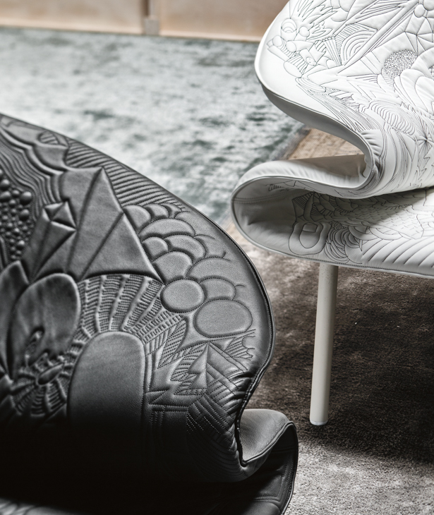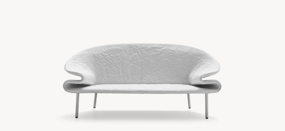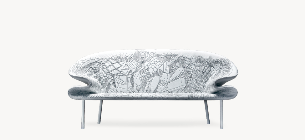 Dalla mano che sola disegna sul foglio durante una telefonata, escono tracce di pensiero. Riflessioni innocenti scandite da una progressione accumulativa, gesti spontanei, scarabocchi; si inizia da una linea, si arriva a una composizione articolata e complessa. è il pretesto per il ricamo. Il progetto del divano riprende la forma di una coperta ripiegata. La seduta è delicata, assorta, i braccioli morbidi, la forma accogliente. Il rivestimento trapuntato segue le linee dello scarabocchio, gli conferisce tridimensionalità. è un pensiero che ci accoglie, un sogno ad occhi aperti.
