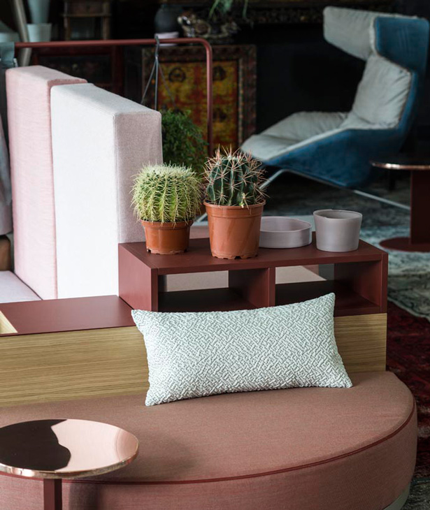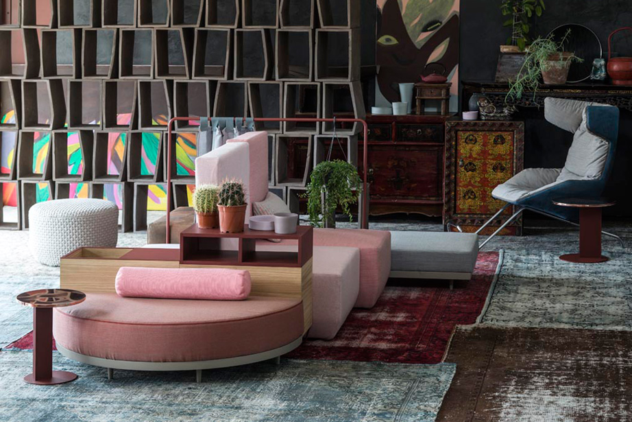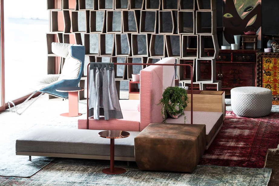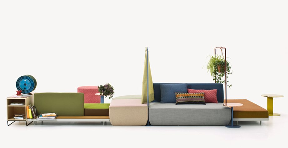 Progettare le relazioni, disegnare traiettorie per appropriarsi degli spazi che l’attualità dispone. Bikini è un paesaggio figlio del tempo e della società che lo esprime. Aree d’attesa, ambiente domestico, la flessibilità componitiva è legata alla mancata necessità di una corrispondenza tra conformazione dello spazio e disposizione degli elementi del sistema, che per varietà estetica e funzionale permettono una non comune trasversalità d’utilizzo. Sgabelli, tavoli, attaccapanni, contenitori, scaffali, separé, piani di appoggio e di seduta: ogni elemento concorre alla relazione e all’interazione. Un intreccio di funzioni e significati che sposta l’idea del divano da fronte televisivo o luogo del riposo a epicentro (aperto) di relazione.
