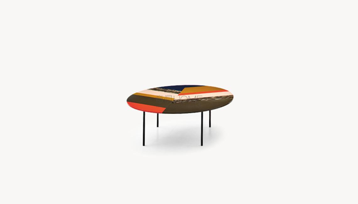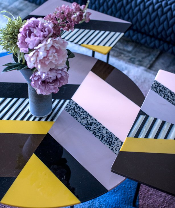 Top in Sintetica? metacrilato colorato e decorato a mano. Tagliato e composto come disegni riportati. Base in acciaio verniciato a polveri nero opaco. Sottopiedi in polipropilene.