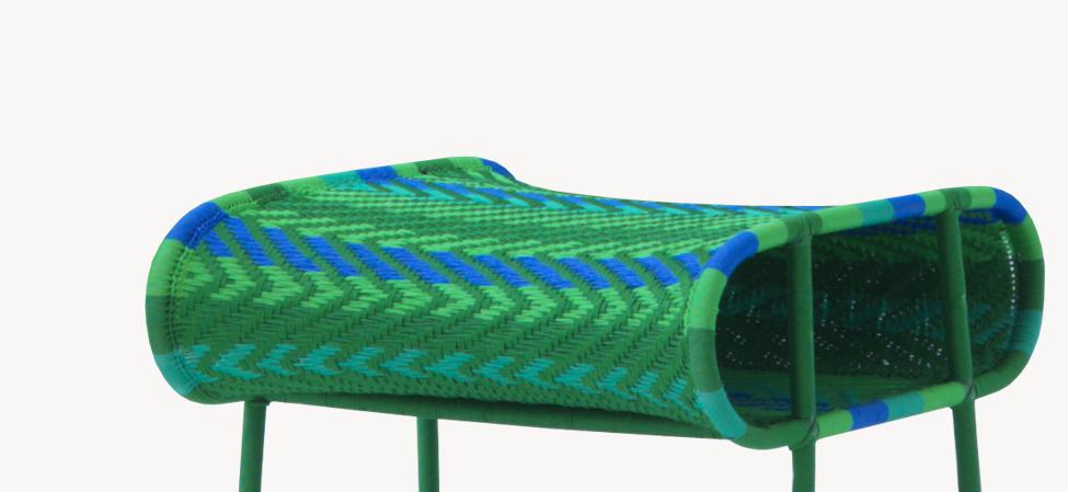 Struttura in acciaio verniciato e fili colorati in polietilene intrecciati a mano. Sottopiedi in PVC.