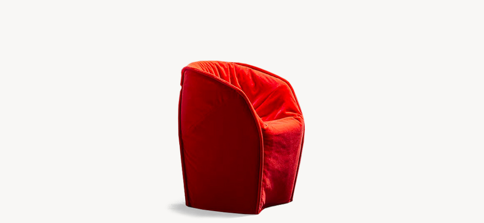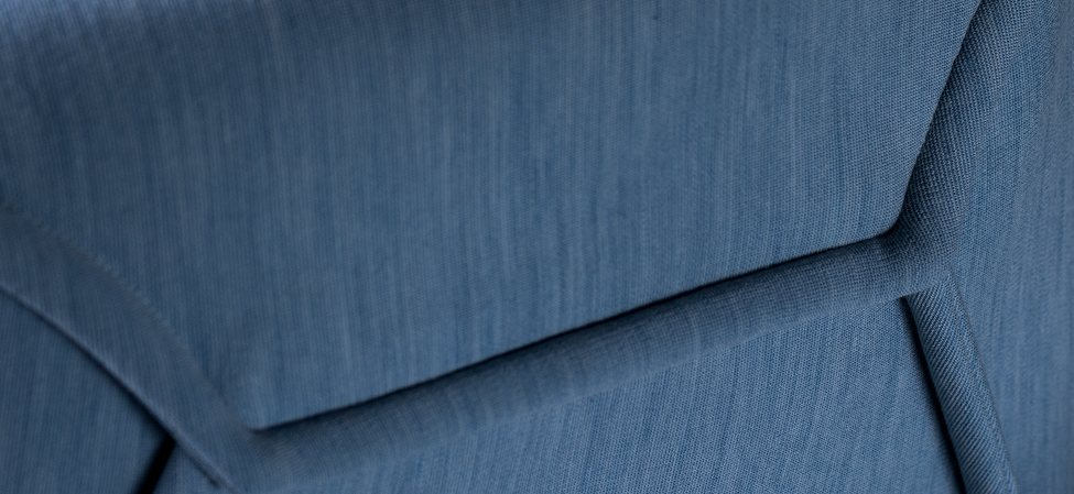 Blocchi smussati dal taglio di una lama immaginaria. L’ordine geometrico è rotto, travolto a favore di un movimento, di un margine che attraversa i perimetri. Le facce rendono evidente la nervatura; alcune cuciture, evidenti come imbastiture, la disegnano, altre scompaiono. L’utilizzo è libero, la superficie morbida. La forma esterna, dal punto di vista dei volumi, appare indipendente dalla struttura e dall’imbottitura interna. Divano, poltrona, poltroncina: un sistema componibile dove ogni elemento mantiene indipendente il carattere, per funzione e presenza scultorea.