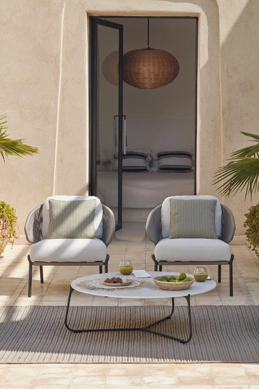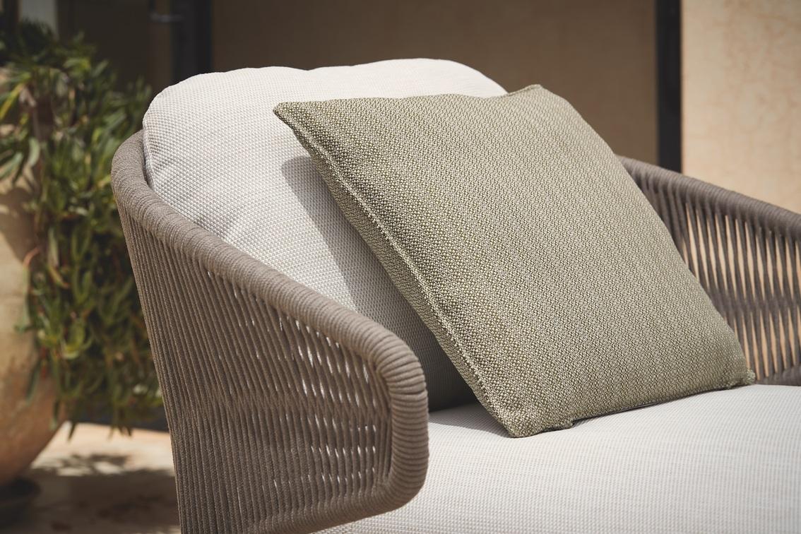 The unique, airy design of the Radius chair, footstool, lounge chair and sofa collection is perfect for exquisite moments of warmth and closeness. The wrap-around back and armrests, made entirely out of rope, blend seamlessly and give each piece a neomodern yet timeless look and feel. Keep it sober or opt for matching backrest cushions designed for optimal seating comfort for long get-togethers.
