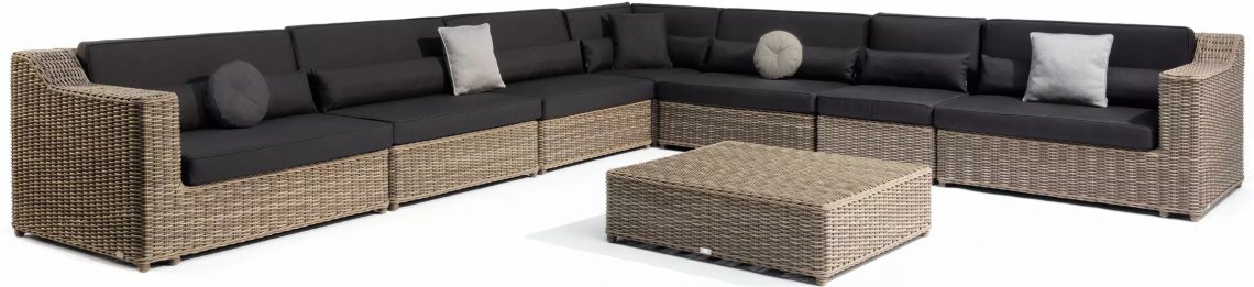 The San Diego collection of tables, chairs, sofas and accessories combines strong water-repellent fabrics and synthetic aged rattan cane work. Designed with a stark, minimalistic eye to detail, each piece also includes the softer, organic appeal of wicker. Natural materials and tones add to the collection’s ageless appeal.