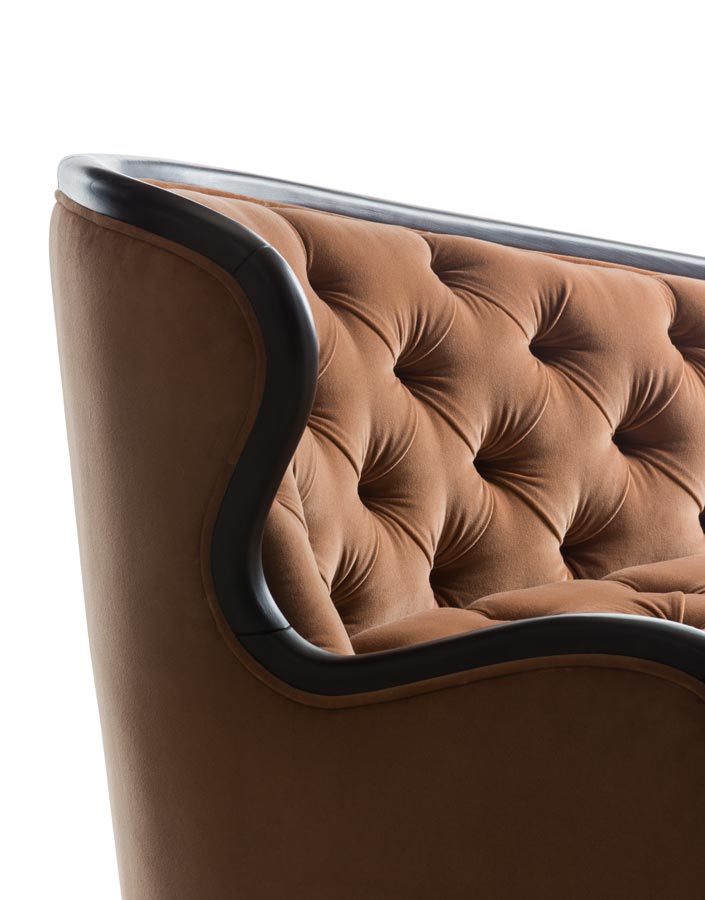 Dormeuse with wooden structure and capitonè finish. Upholstery in fabric or leather. Basement in wood.