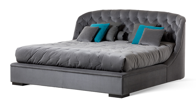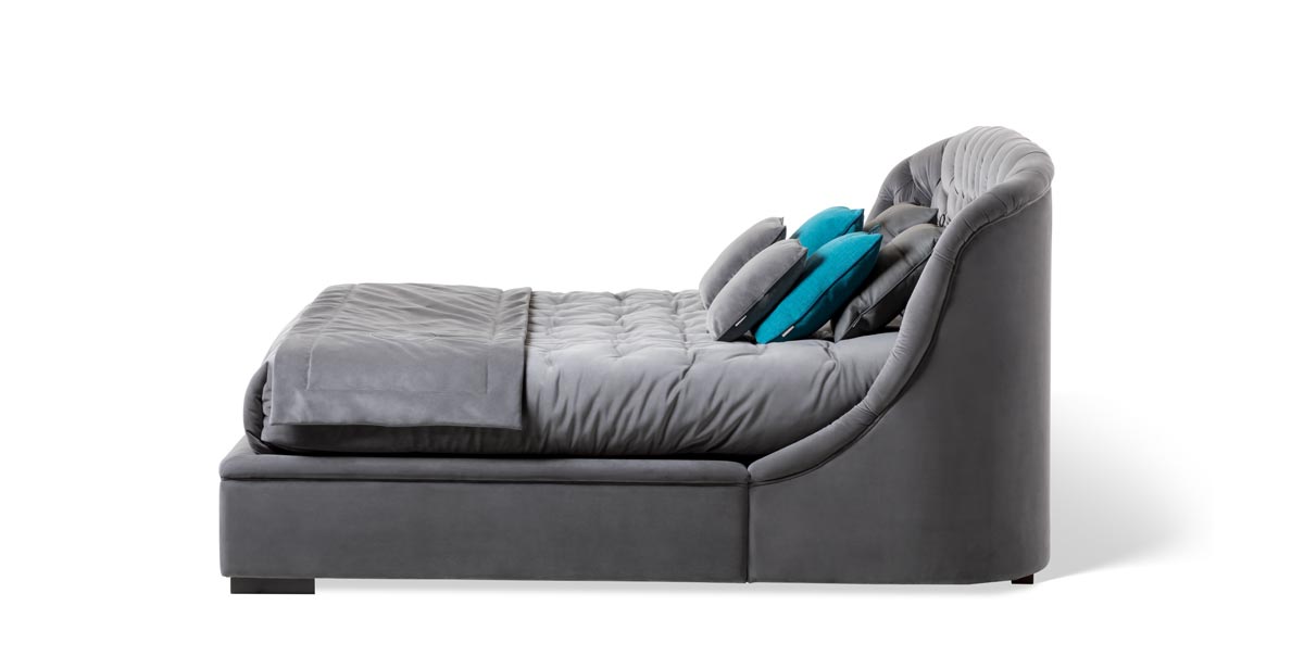 Letto imbottito con piedi laccati color argento satinato. Rivestimento tessuto o pelle.