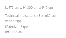 Printed non-woven paper, each decoration measures 372 x 300 cm and is presented as 8 strips to gather, easily to stick on the wall (with a special non-woven glue). All decorations can be cut again from height and width to be adapted to all wall dimensions.