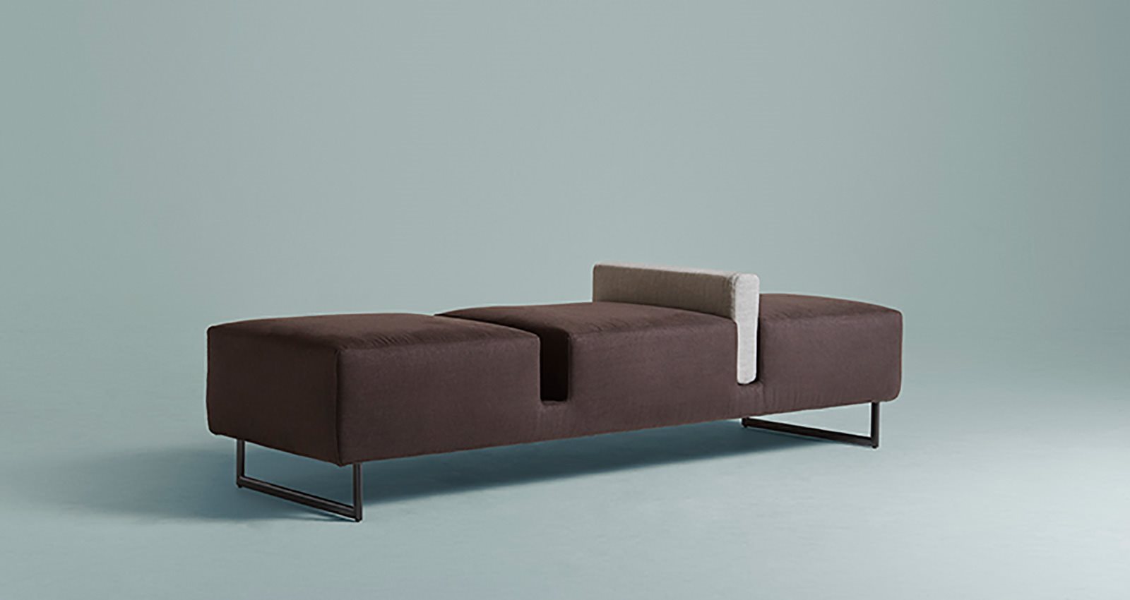 A padded two or three-seat bench with clean, essential lines. The housing for the (optional) cushion can also function as a place for magazines or objects. Ideal for residential and contract settings.