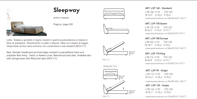 Bed. Wooden headboard and bed edge covered in polyurethane foam and polyester fiber lining. Fabric or leather cover. Beechwood bed slats.