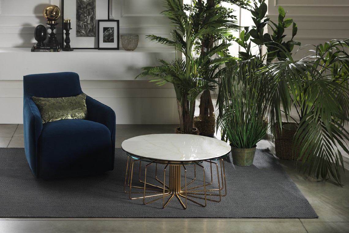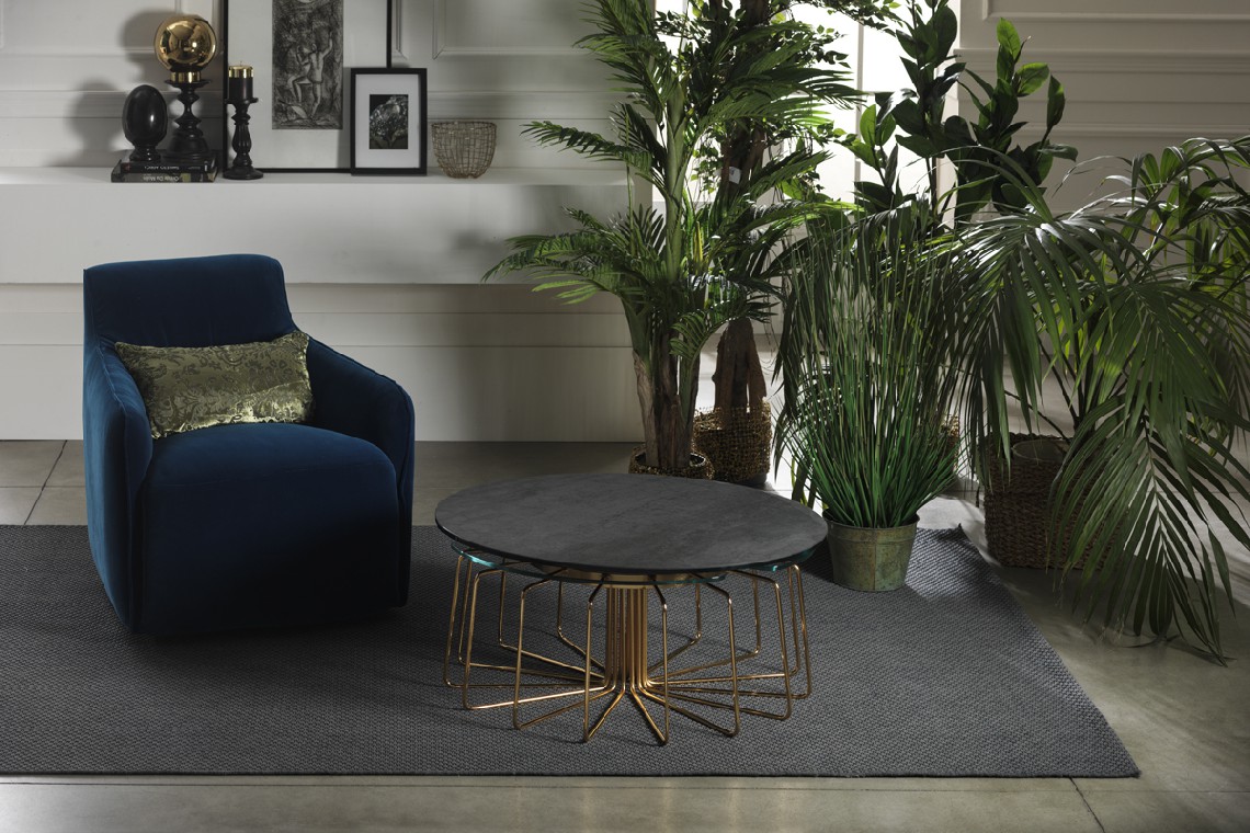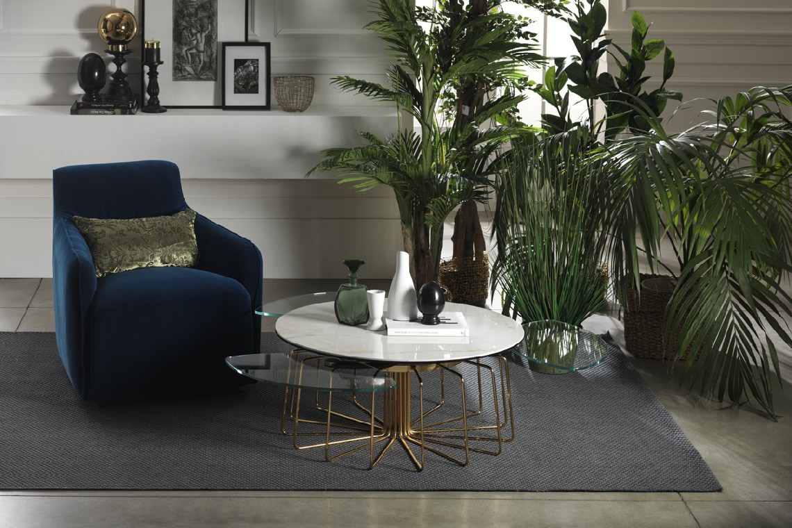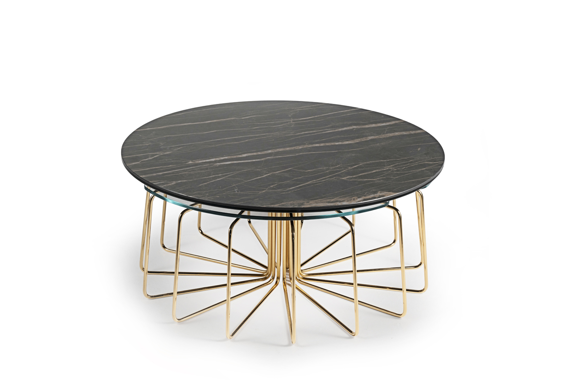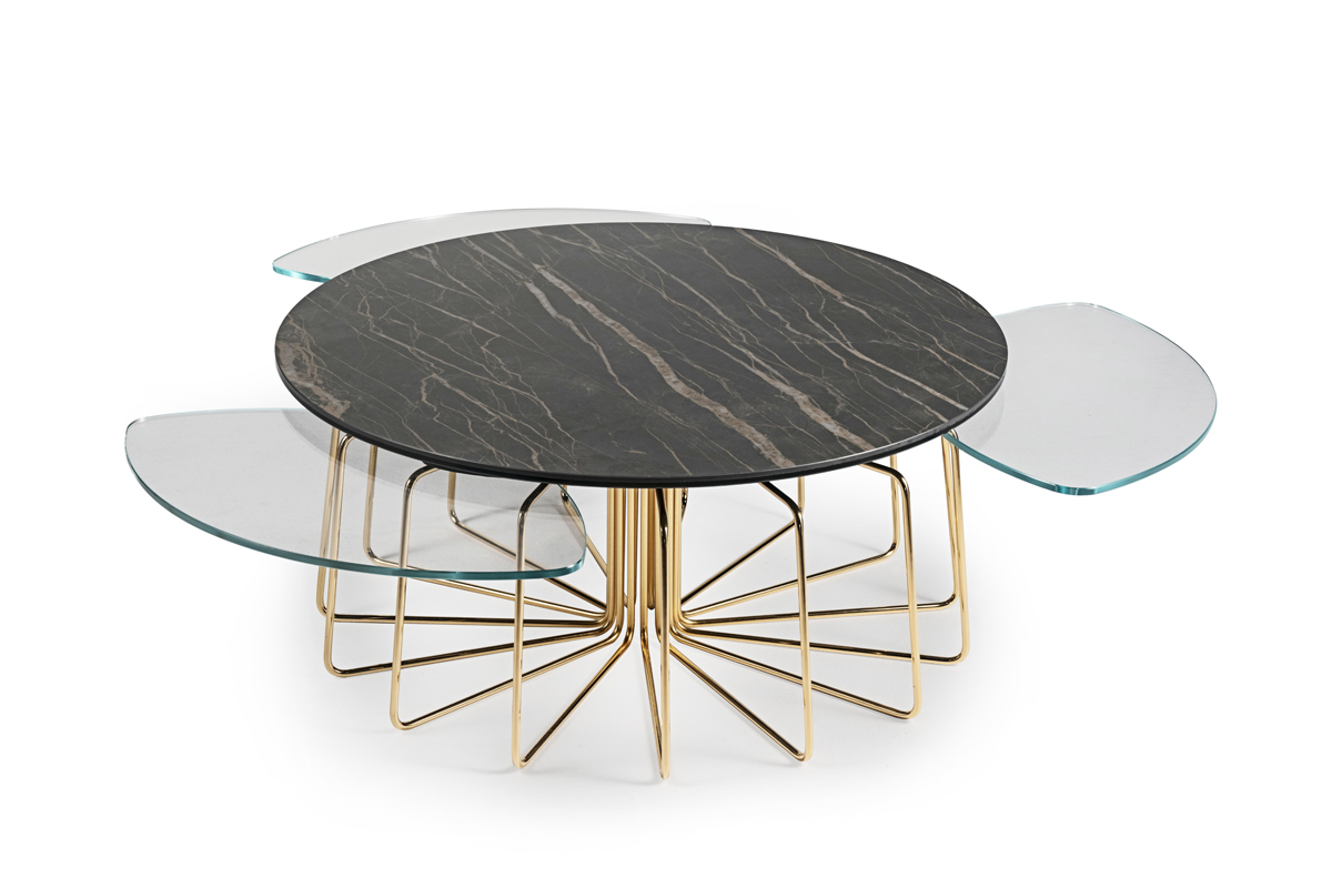 TAVOLINO ESTENSIBILE CON PIANI IN CERAMICA E CRISTALLO, BASE IN ACCIAIO VERNICIATO O GALVANIZZATO. DOTATO DI UN INNOVATIVO MECCANISMO CHE, ATTRAVERSO LA SOLA ROTAZIONE DEL PIANO SUPERIORE, PERMETTE AI TRE PIANETTI SOTTOSTANTI DI APRIRSI.