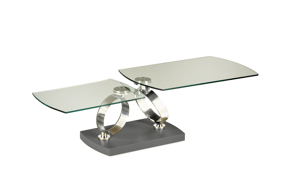 TAVOLINO ESTENSIBILE CON PIANI GIREVOLI SINCRONIZZATI IN CRISTALLO BASE IN LEGNO E SUPPORTI IN ACCIAIO VERNICIATO O GALVANIZZATO.