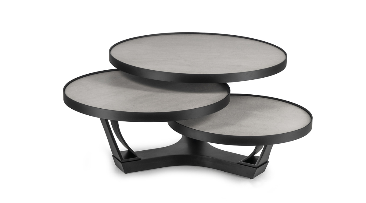 TAVOLINO ESTENSIBILE CON 3 PIANI IN CERAMICA. DOTATO DI UN INNOVATIVO MECCANISMO SINCRONIZZATO DI APERT URA CHE PERMETTE AI 3 CRISTALLI DI APRIRSI CON UN SOLO GESTO. SUPPORTI IN ACCIAIO VERNICIATO.