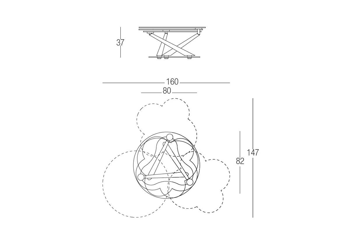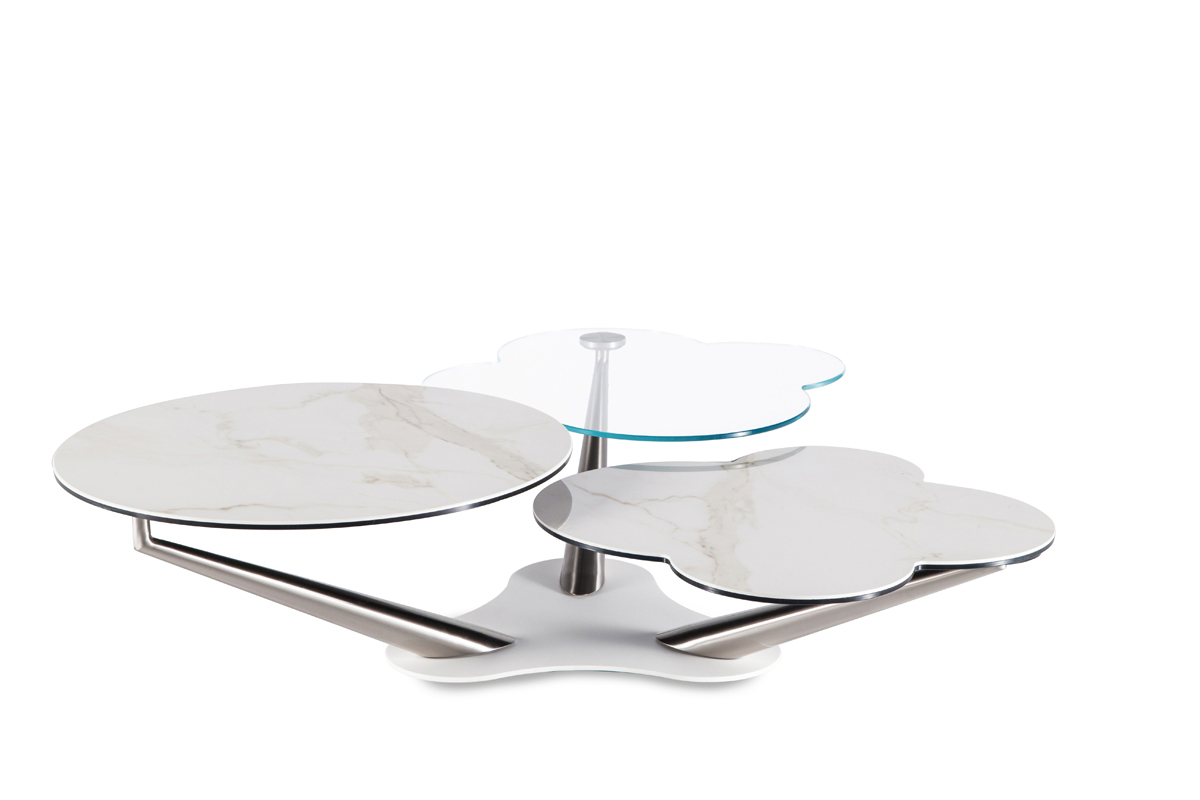 TAVOLINO ESTENSIBILE CON 3 PIANI GIREVOLISINCRONIZZATI IN CRISTALLO O CERAMICA. LA PARTICOLARE GEOMETRIA DEI PIANI E DEL MECCANISMO PERMETTE AL TAVOLO IN POSIZIONE CHIUSA DI NASCONDERE I PIANI SOTTOSTANTI. BASE E SUPPORTI IN ACCIAIO VERNICIATO OCROMATO.