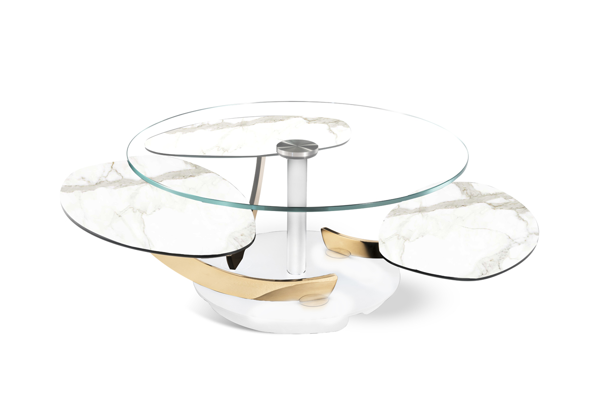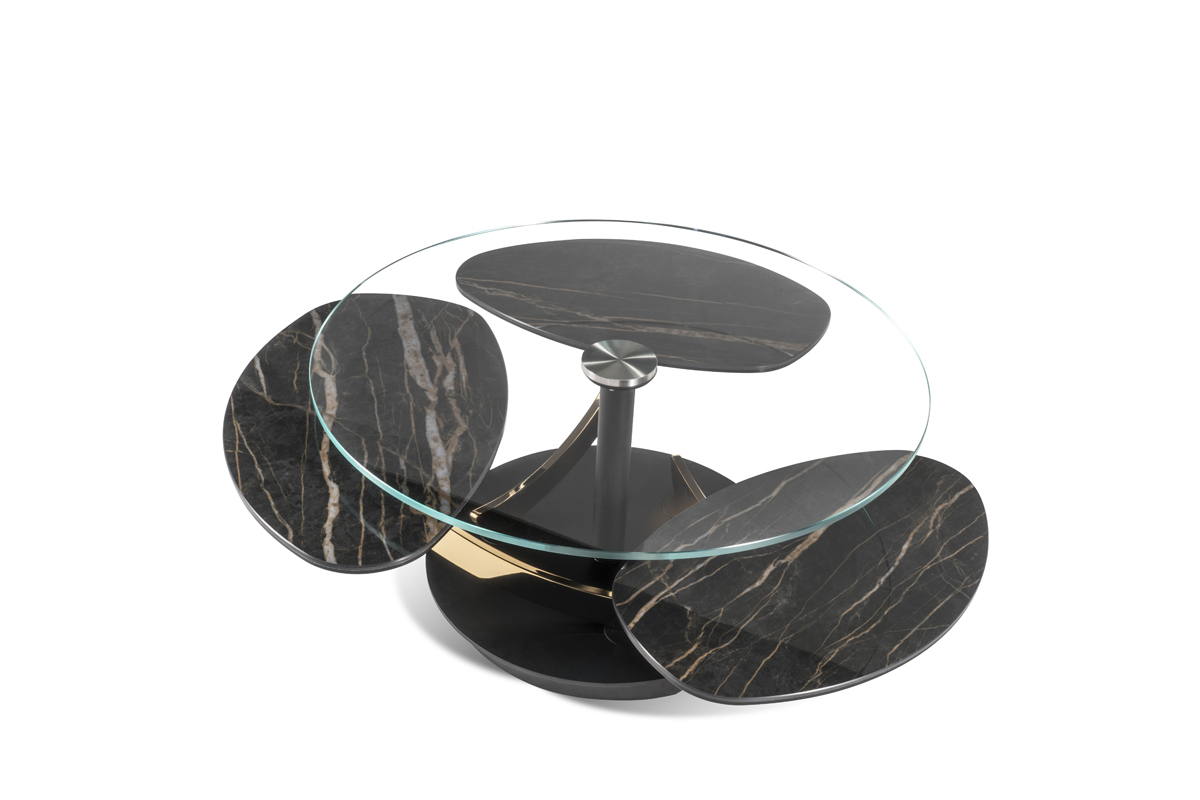 TAVOLINO ESTENSIBILE DOTATO DI UN INNOVATIVO MECCANISMO CHE, ATTRAVERSO LA SOLA ROTAZIONE DEL PIANO SUPERIORE, PERMETTE AI TRE PIANETTI SOTTOSTANTI DI APRIRSI. IN POSIZIONE CHIUSA IL PIANO SUPERIORE NASCONDE I PIANI SOTTOSTANTI