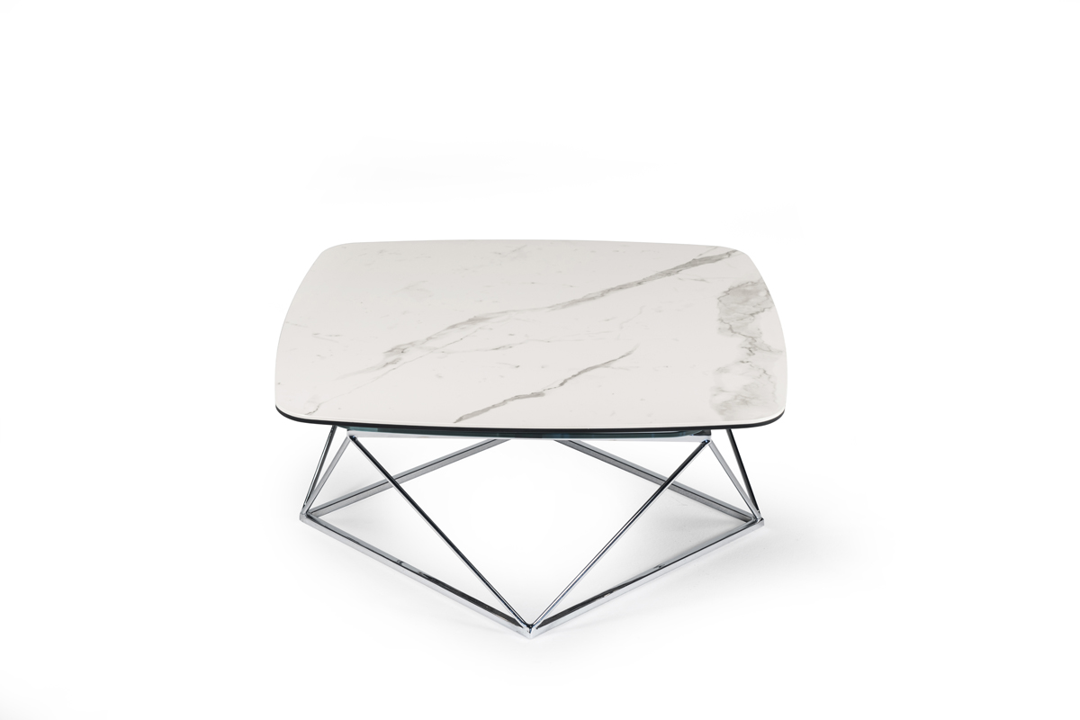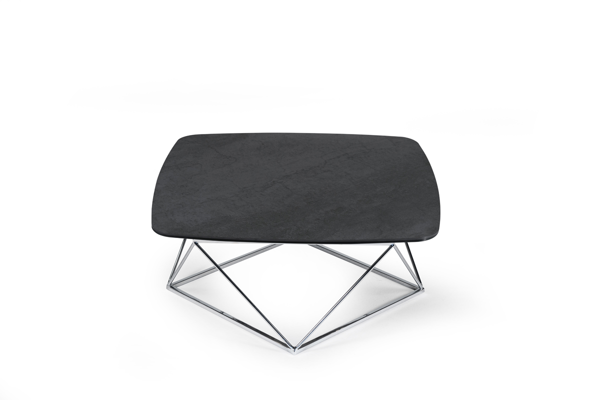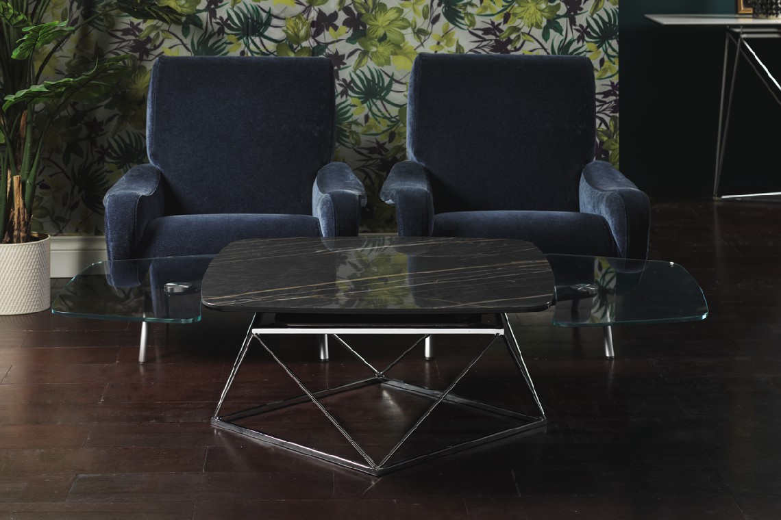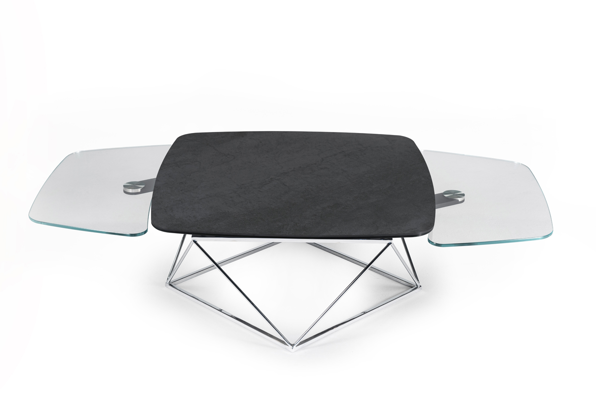 TAVOLINO ESTENSIBILE CON PIANI IN CERAMICA E CRISTALLO, BASE IN ACCIAIO VERNICIATO O GALVANIZZATO. DOTATO DI UN INNOVATIVO MECCANISMO CHE, ATTRAVERSO LA SOLA ROTAZIONE DEL PIANO SUPERIORE, PERMETTE AI DUE PIANETTI SOTTOSTANTI DI APRIRSI. DISPONIBILE ANCHE SENZA MECCANISMO.