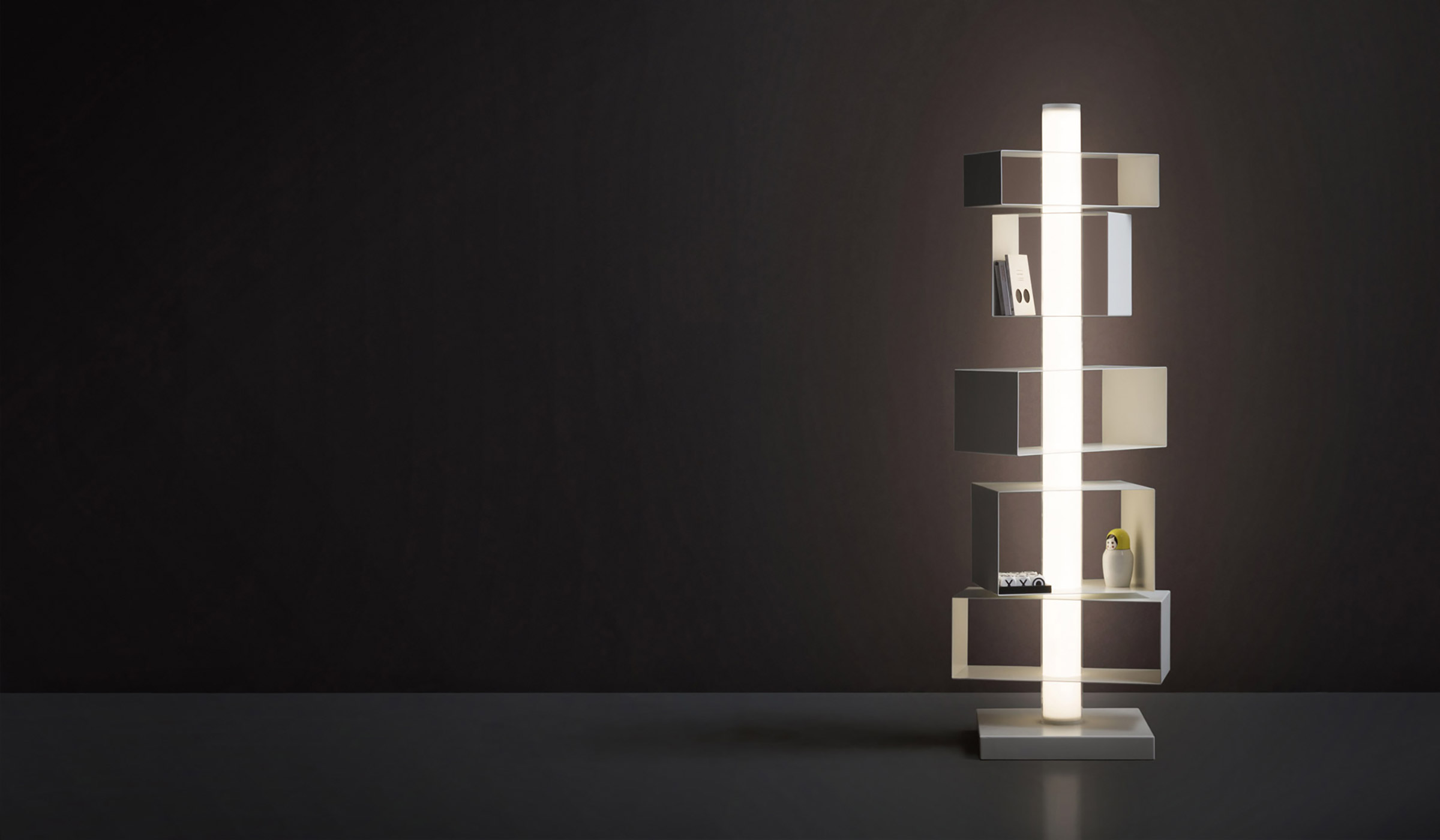 Despite being inspired by ancient totems, this piece of furniture can be used as a bookcase, a display unit and a light source, projecting an undeniably contemporary image.