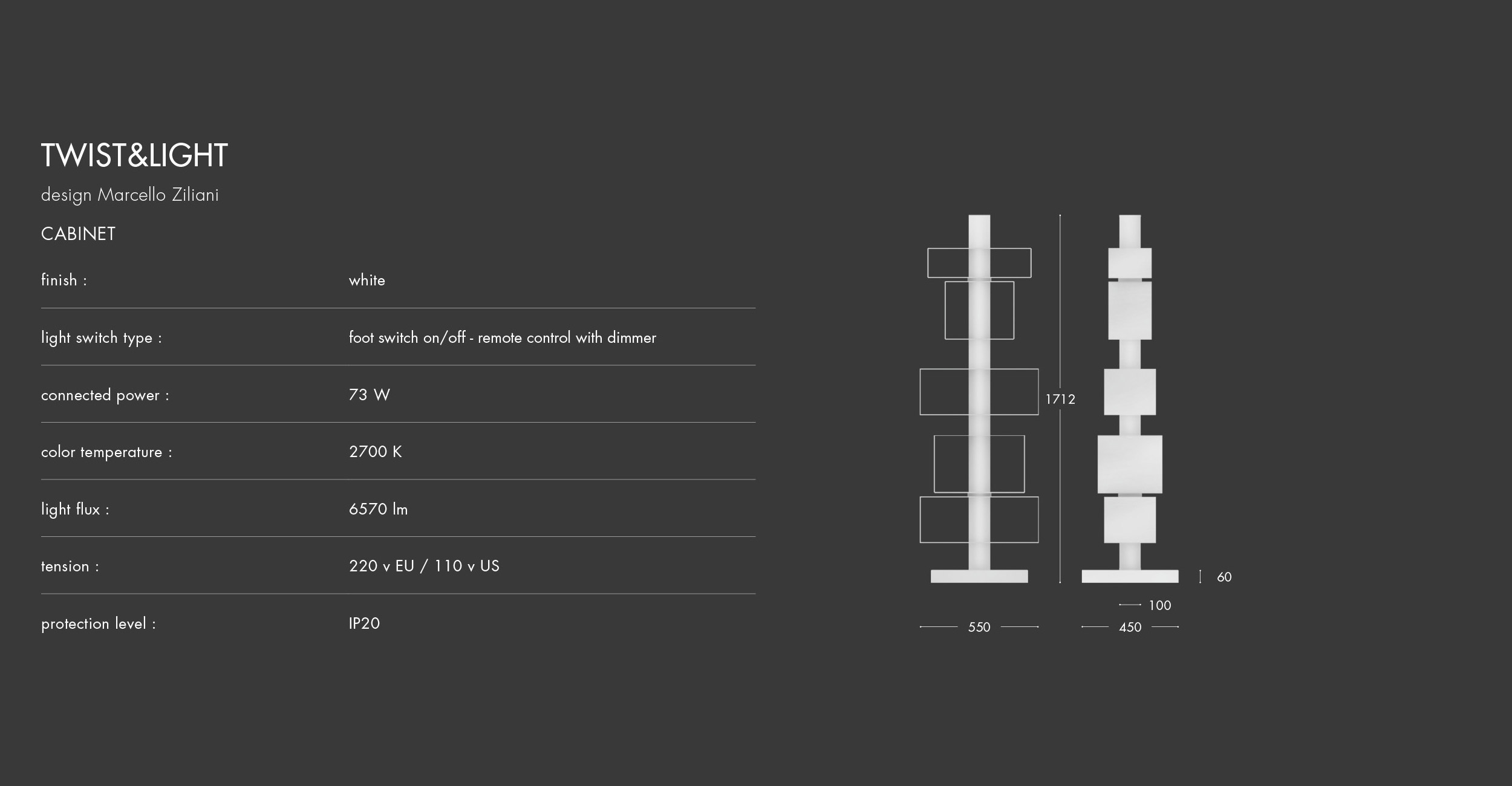 Five swivel containers of different dimensions with integrated LED lights are attached to the central column. Rotating the containers facilitates access to the content and modifies the quantity of light diffused. The arrangement of these containers can be defined during the assembly stages to satisfy the client’s taste and specific requirements.