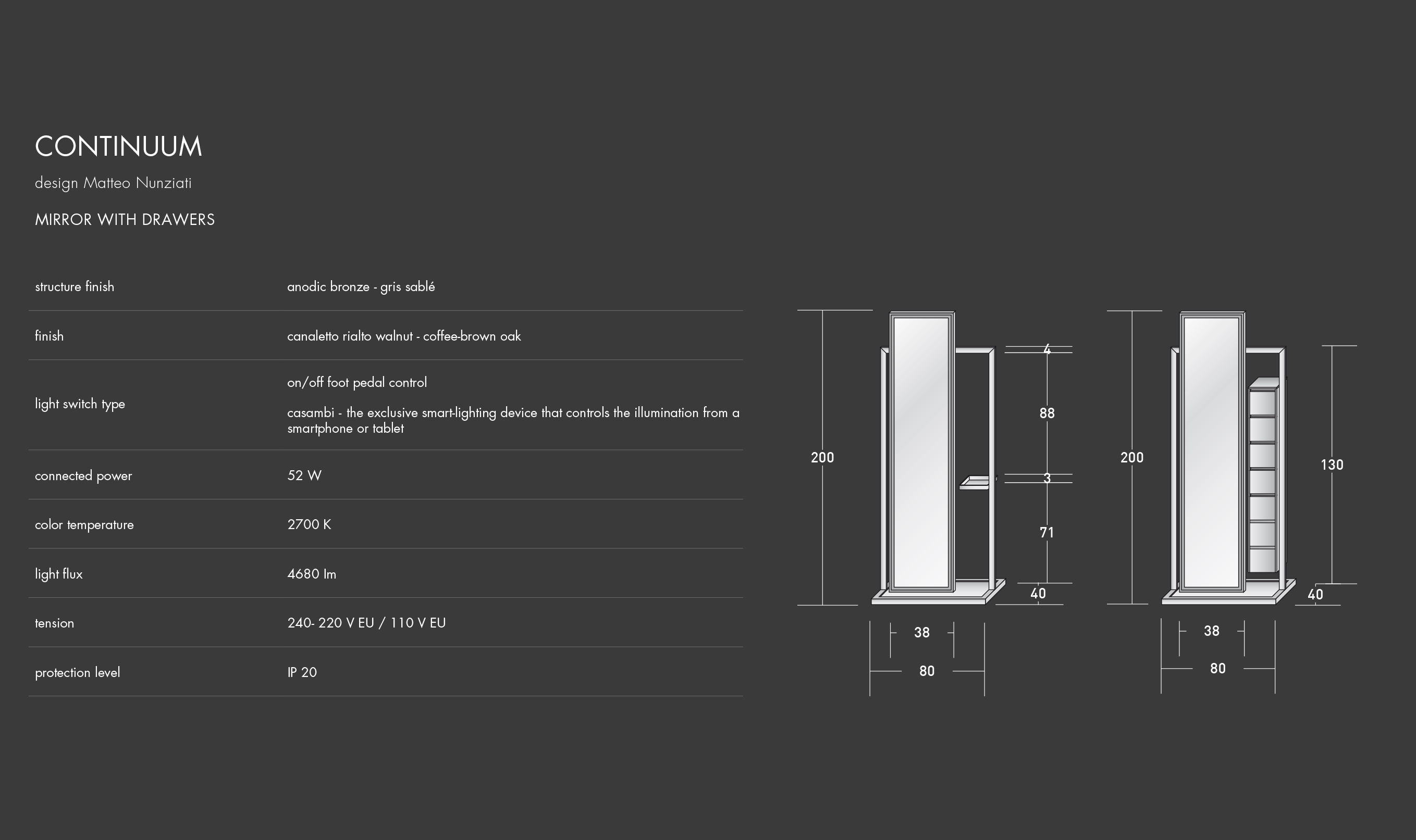 The free-standing mirrors/clothing racks reflect the lines of other articles in the Continuum collection. The support structure is steel (available with an anodic bronze or gris sablé finish). Two versions are available: the first has a series of small vertically stacked drawers; the second includes a clothing rack and a small tray.