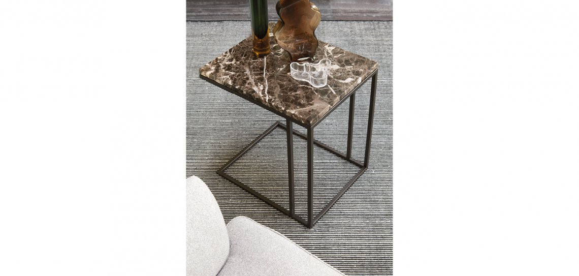 Metrico Small è la variante del modello Metrico. Si distingue per la forma squadrata più slanciata. La struttura metallica in finitura canna di fucile sorregge il piano superiore, disponibile in diverse versioni in marmo.