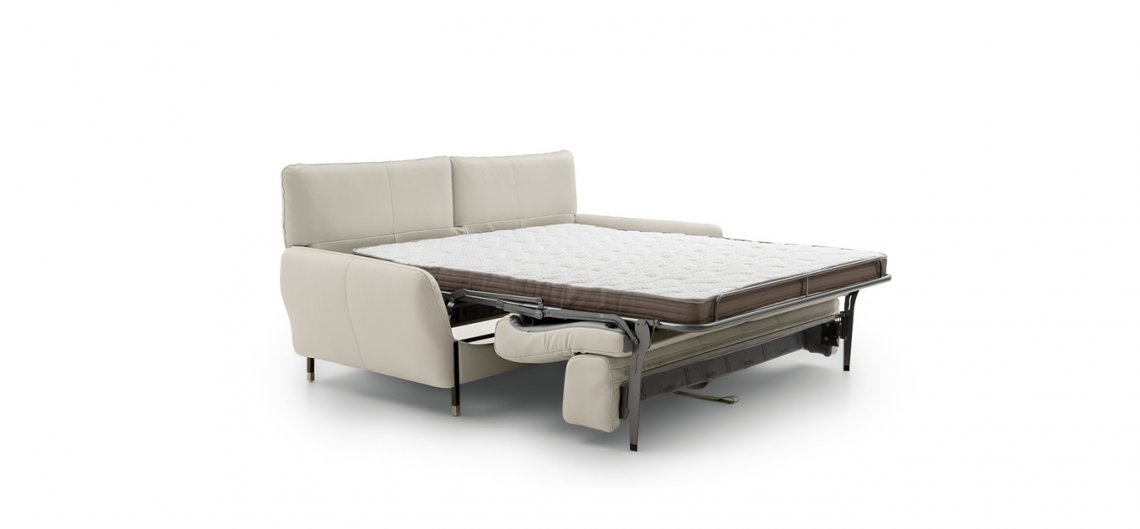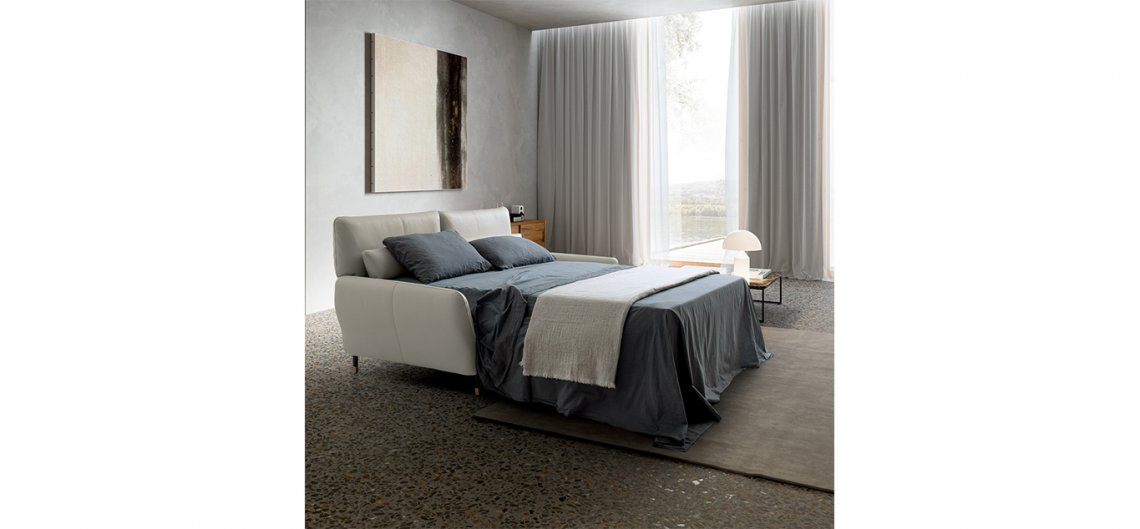 Per un soggiorno all’insegna della leggerezza e dell’eleganza, Giotto si presenta con alti piedini in finitura canna di fucile con puntale in oro conferendo una nota di classe. Pronto in pochi secondi trasformandosi in un comodo letto matrimoniale, lo schienale si alza e diventa una testiera imbottita, mentre dalla seduta con un semplice movimento e senza bisogno di rimuovere la cuscinatura si estrae una rete elettrosaldata completa di materasso. Disponibile in pelle e tessuto.