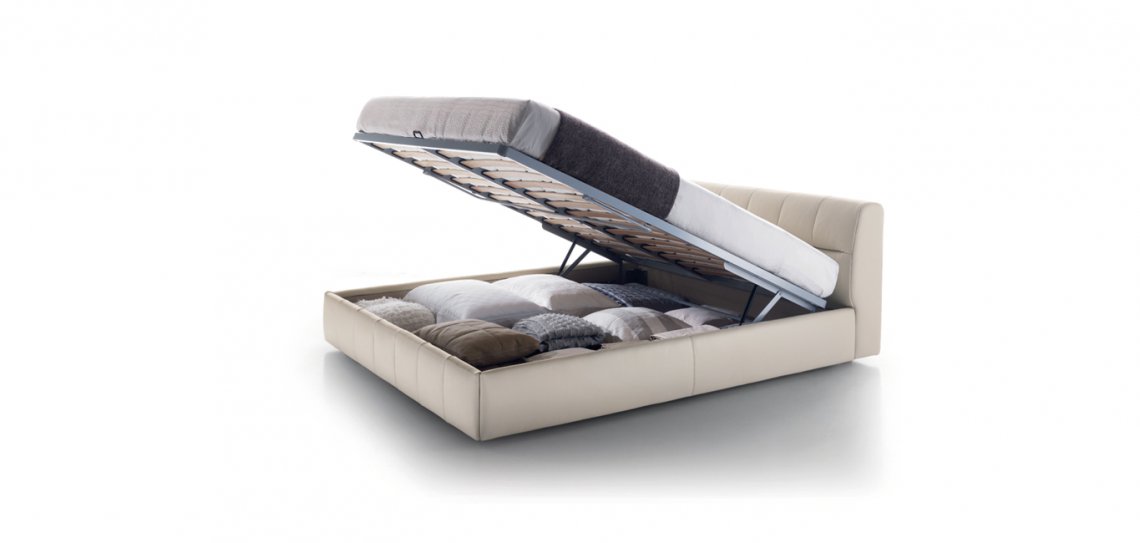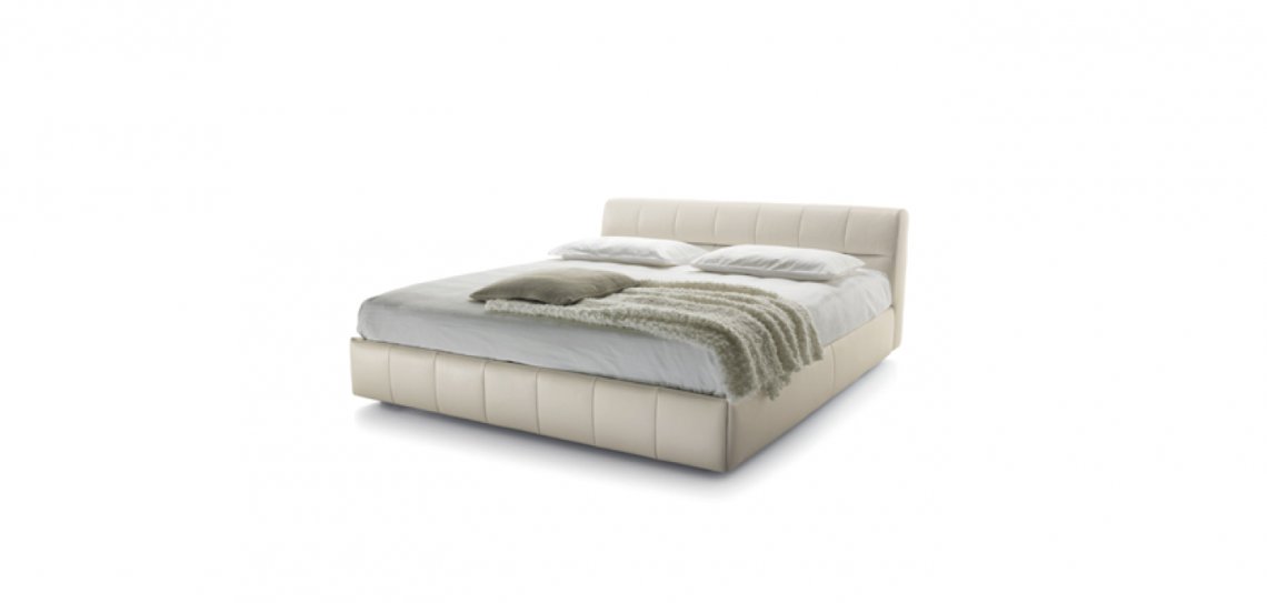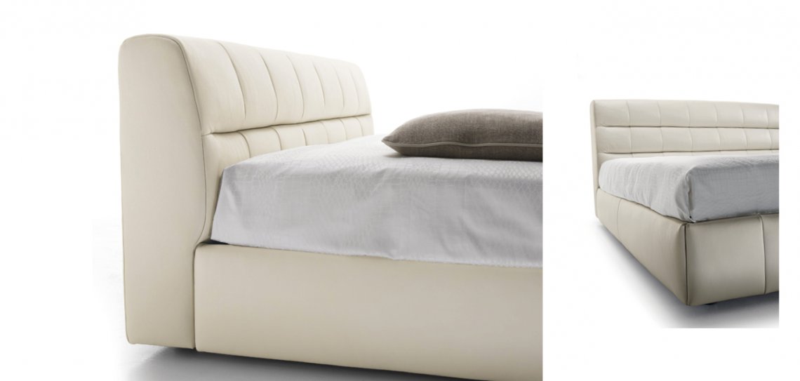 Linee verticali per segnare il giroletto imbottito. La testata, disponibile in due altezze, è caratterizzata invece dall’incrocio di queste linee con segni orizzontali di forte carattere. Intersecandosi formano una texture regolare dal design giovane e contemporaneo. La versione contenitore è disponibile con sistema di apertura rete “a un movimento” e “a due movimenti”.