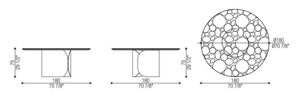 Il tavolo rotondo con base metallo Oscar è caratterizzato da un vivace contrasto materico tra la base e il piano in marmo. La struttura cilindrica arrotondata si apre su un lato per mostrare l’interno cavo.