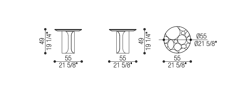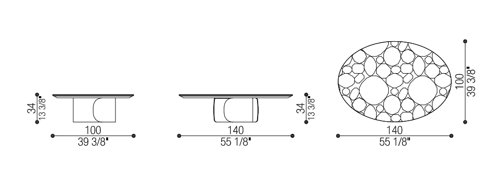 Il tavolino ovale con base in metallo Gabriel presenta un vivace contrasto materico tra la base metallica e il piano in pregiato marmo. La struttura cilindrica si apre su un lato per mostrare l’interno cavo.