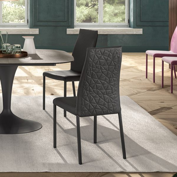 Sedia completamente rivestita in pelle o eco pelle con motivo geometrico posto sul retro dello schienale.