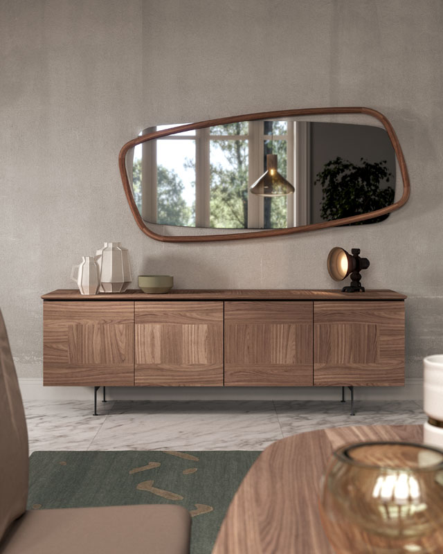 Madia con contenitore laccato. Ante e piano rivestiti in essenza. Ripiani trasparenti e piedini in metallo verniciato.