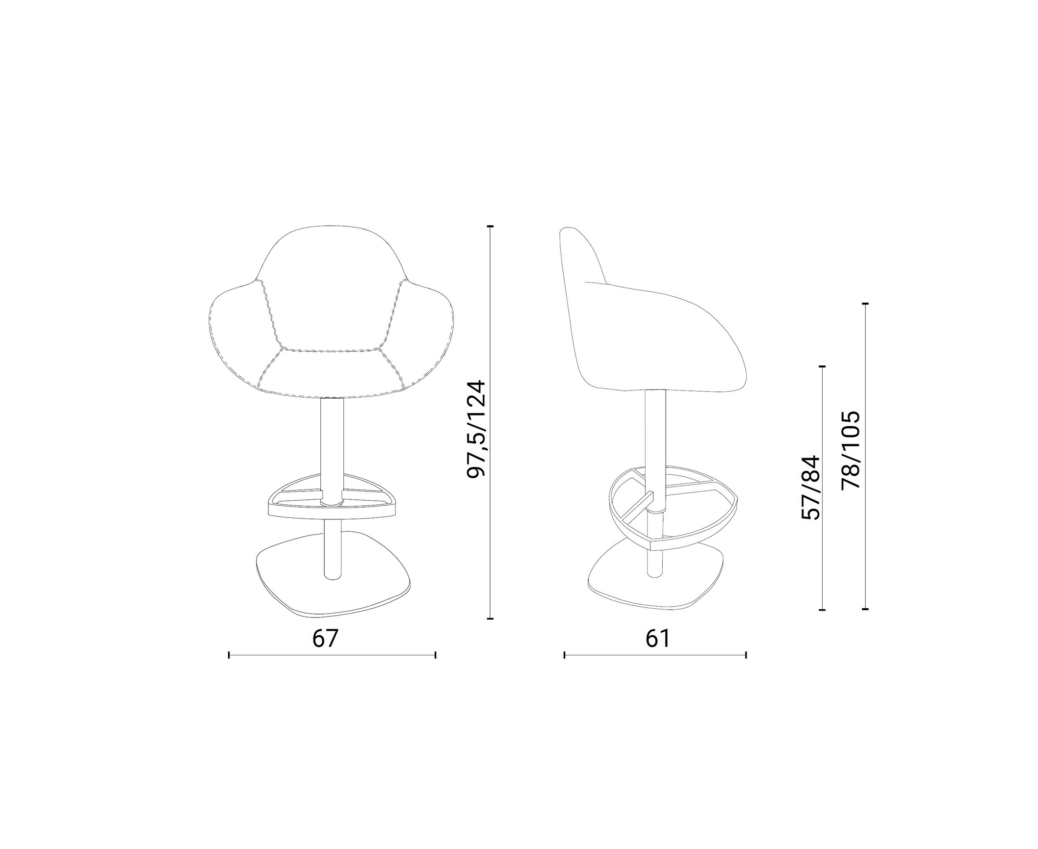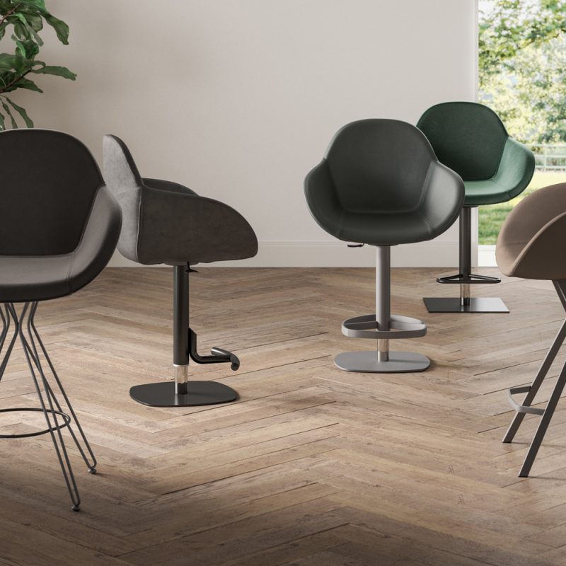 Sgabello con alzata a gas in metallo e seduta rivestita in pelle, eco pelle nabuk o velvet.