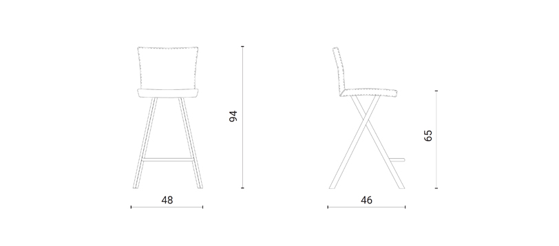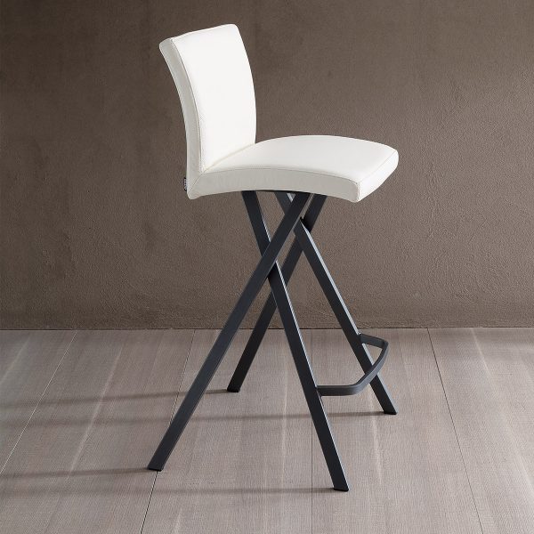 Sgabello fisso, basamento in metallo e seduta rivestita in pelle o eco pelle nabuk.