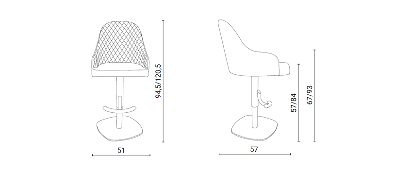 Sgabello con alzata a gas, basamento in metallo e seduta rivestita in pelle, velvet o eco pelle nabuk con interno trapuntato.