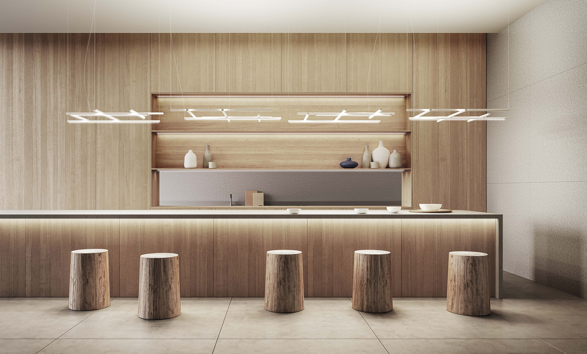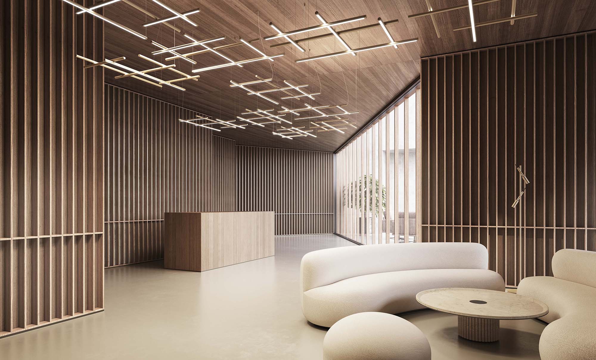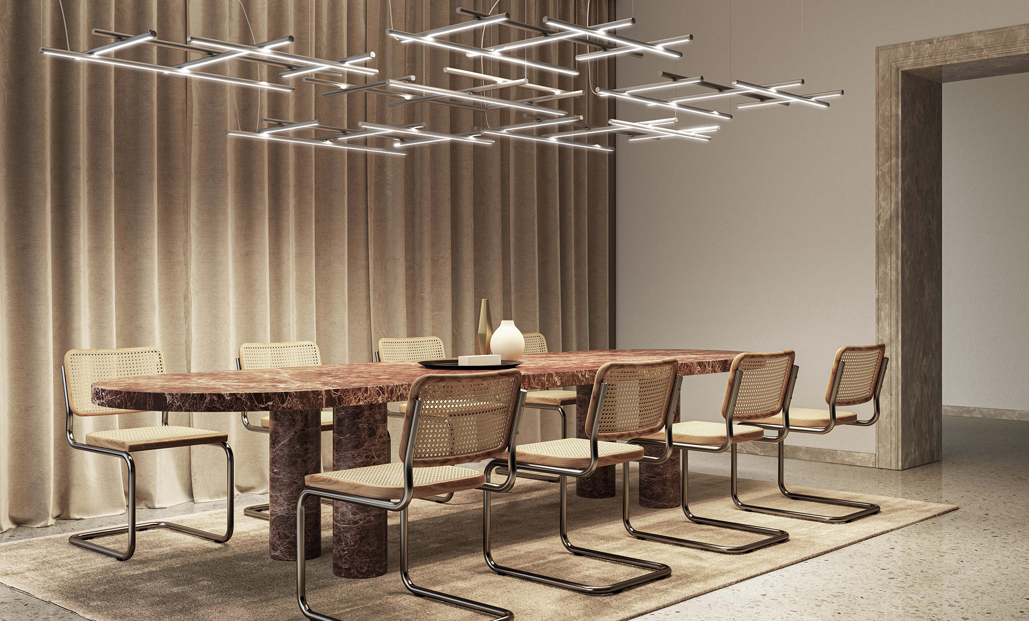 Un corpo illuminante costituito dalla combinazione di elementi lineari trasversali e longitudinali, in grado di caratterizzare con le sue infinite possibilità compositive la scenografia di ogni ambiente. Le numerose varianti consentono un’installazione libera e intuitiva sia a sospensione che a soffitto o parete. La doppia emissione costituisce un ulteriore fattore di versatilità: nella versione a sospensione infatti è possibile invertire l’orientamento delle funi, permettendo l’installazione del prodotto su entrambe le facce per una maggiore illuminazione diretta o indiretta. I modelli a sospensione sono inoltre abbinabili agli articoli To-Be 22, per uno sviluppo tridimensionale delle composizioni. Disponibile nelle finiture bianco, nero satinato, bronzo, ottone satinato e titanio, con diffusori opalini o neri.