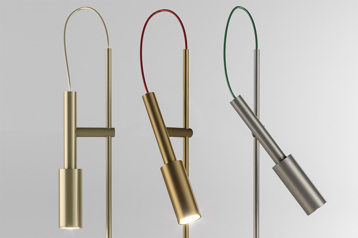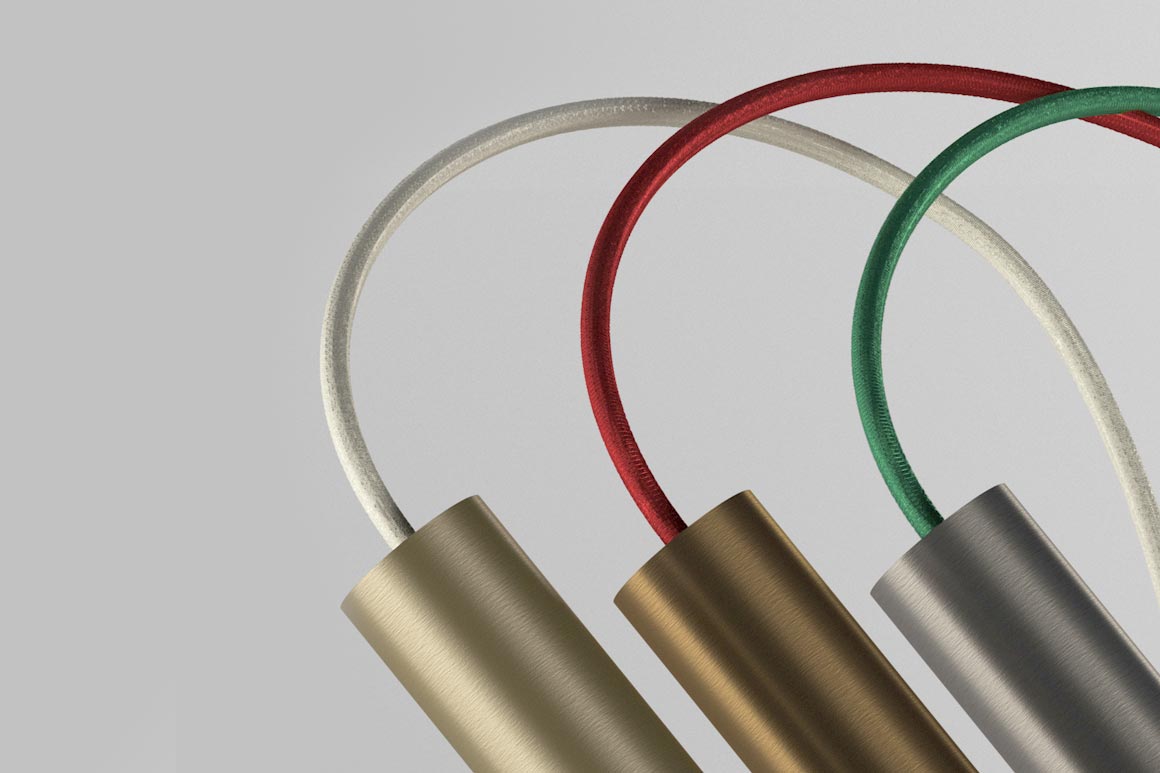 Lampada da tavolo in alluminio tornito. Tubino Plus è disponibile in versione con comando Step DIM a 5 regolazioni di intensità luminosa in finitura champagne, bronzo e titanio con cavo di alimentazione tra la testa e la struttura in tessuto.