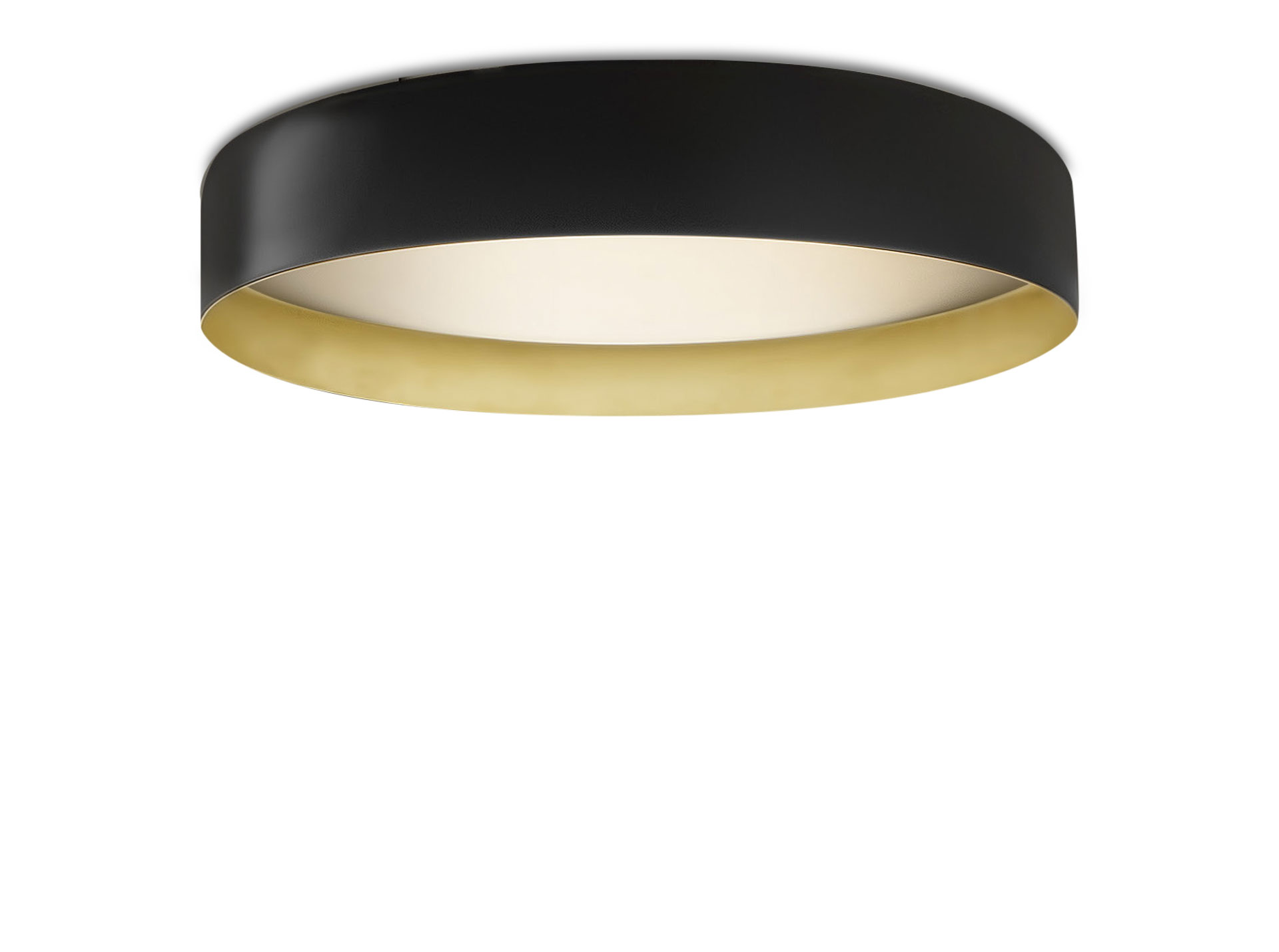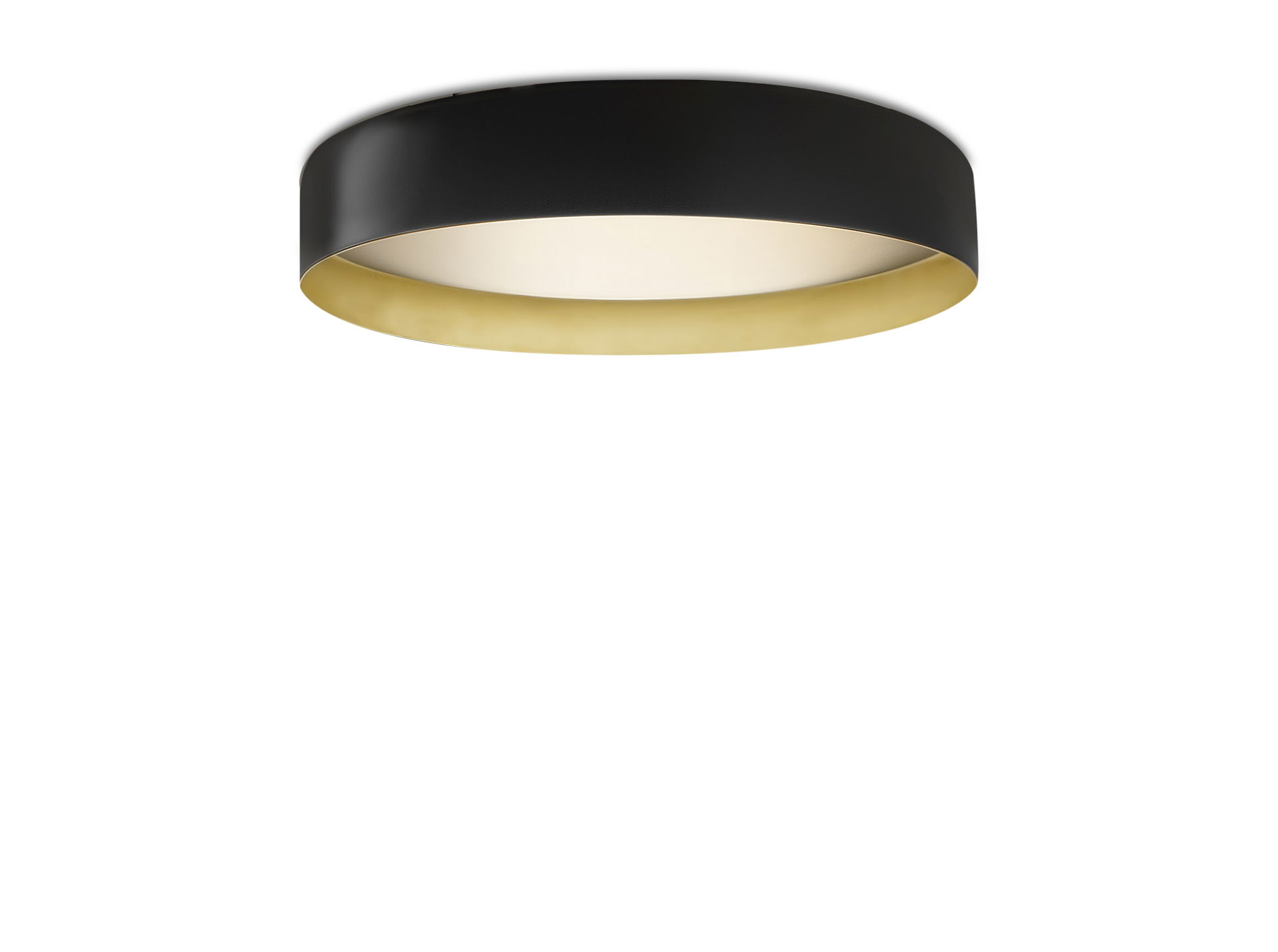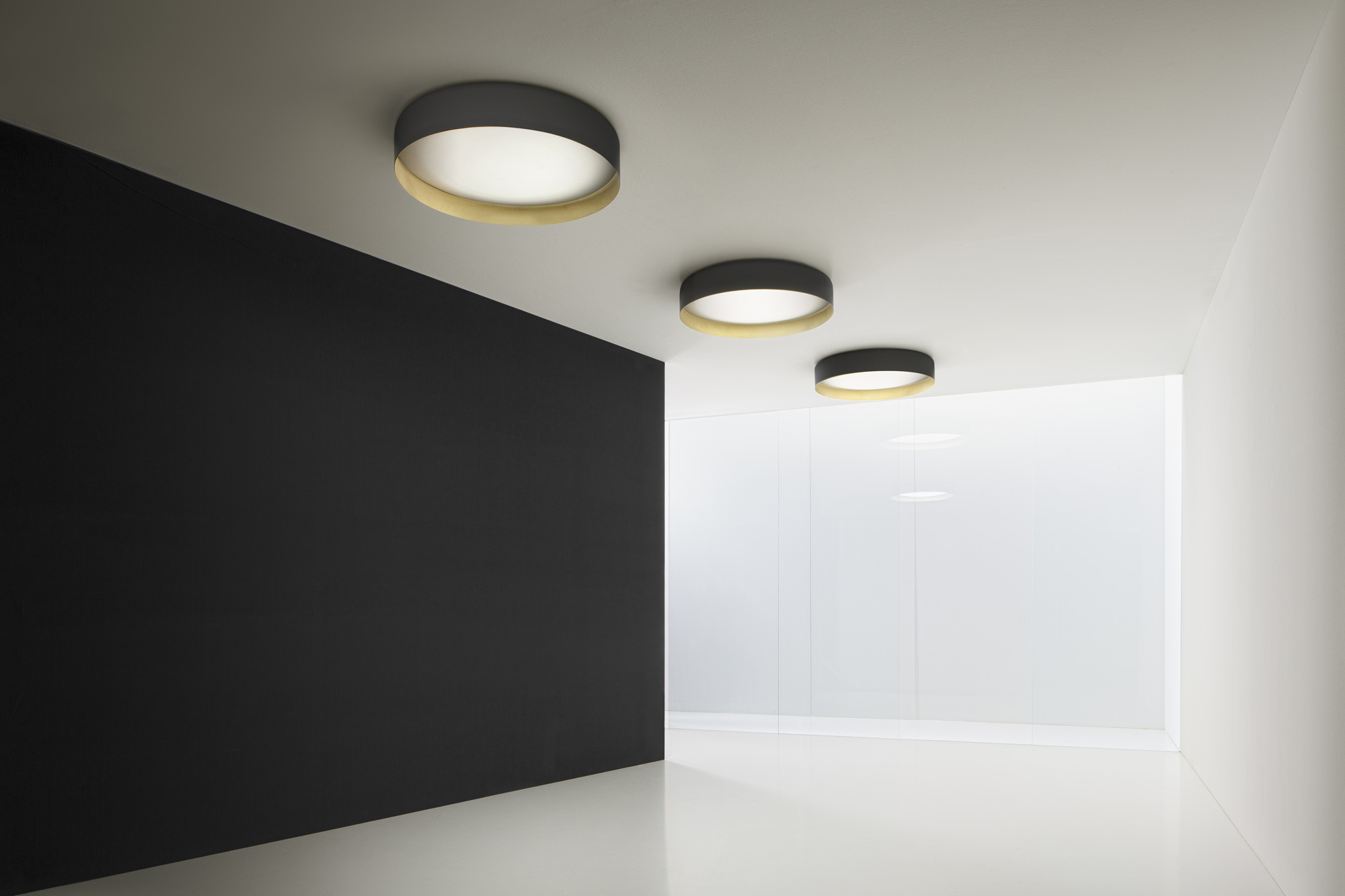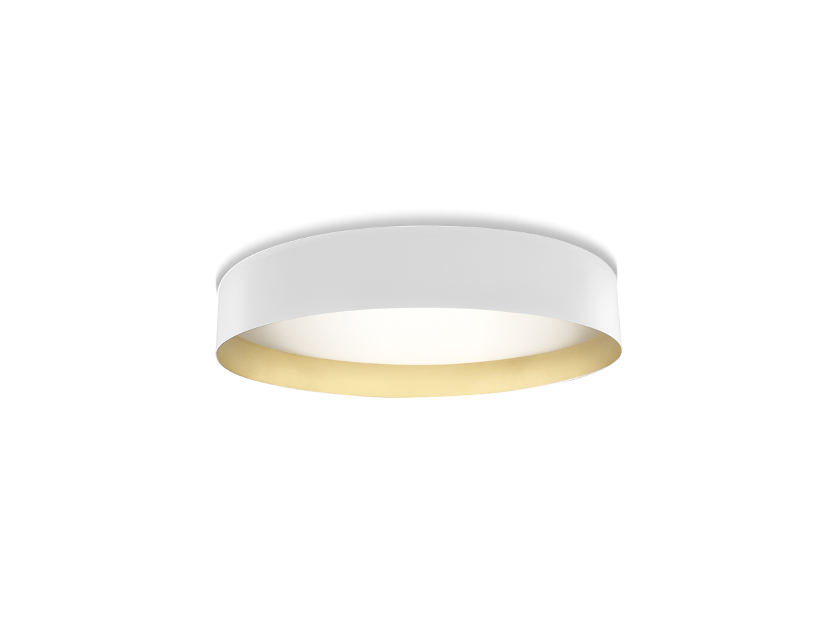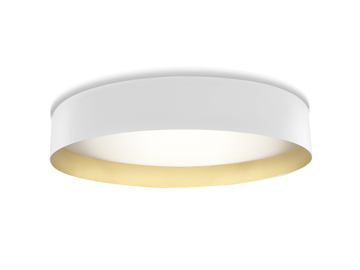 Lampada a sospensione e soffitto con diffusore microprismato a luminanza controllata. Versione a soffitto con emissione diretta attraverso modulo LED disponibile anche tunable white. La versione sospensione combina emissione diretta e indiretta dimmerabili. Corpo lampada in alluminio tornito rifinito con vernice poliacrilica nelle versioni esterno nero e interno oro o esterno bianco e interno oro. Possibili colori custom su richiesta. Ideale per hall, zone living, grandi spazi, e uffici.