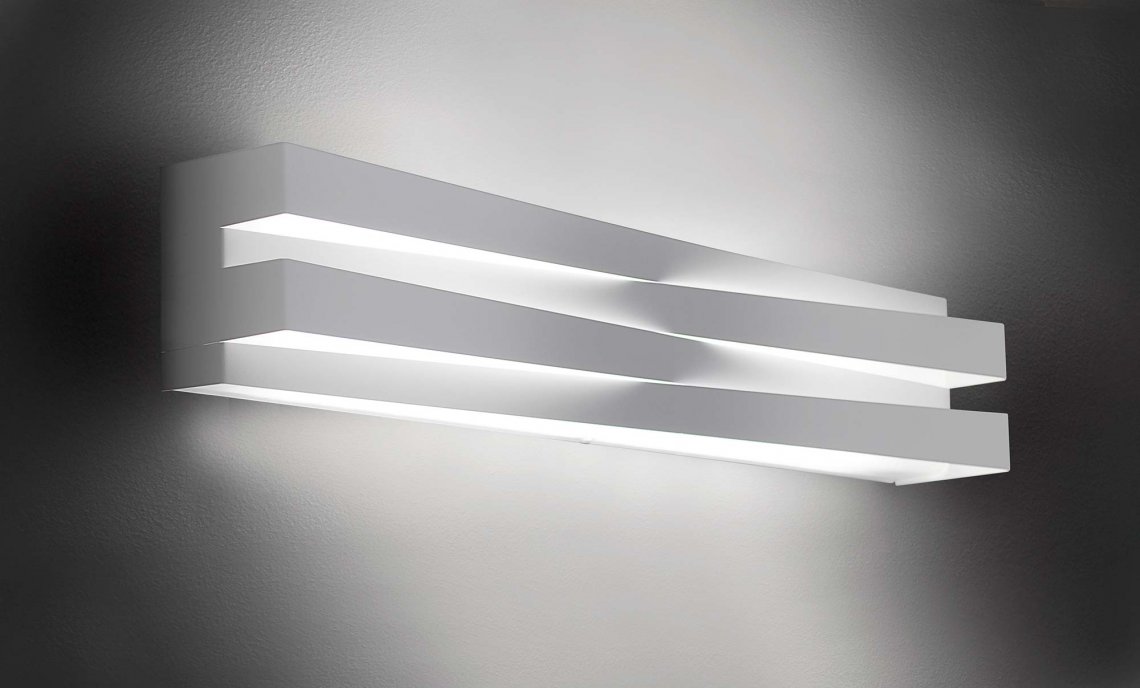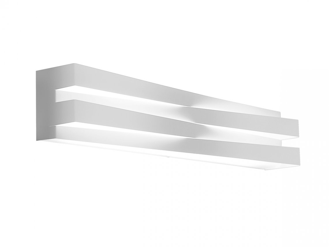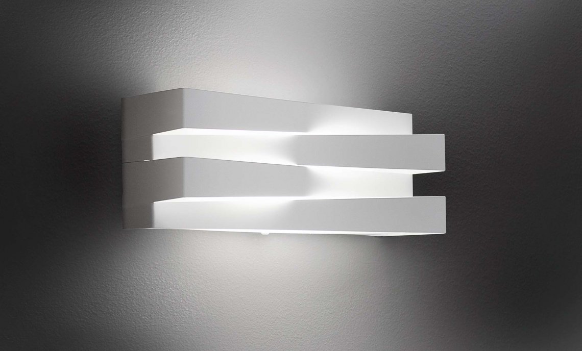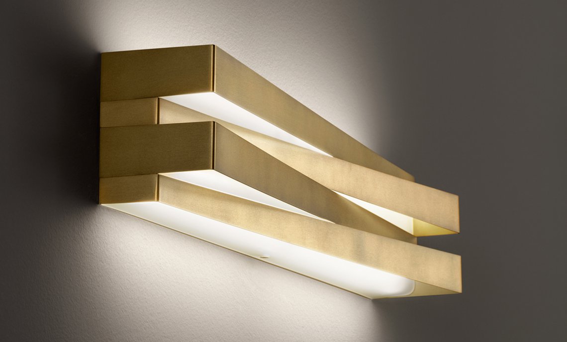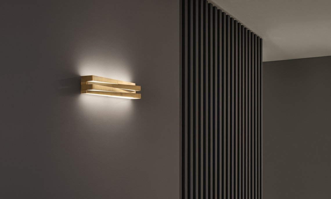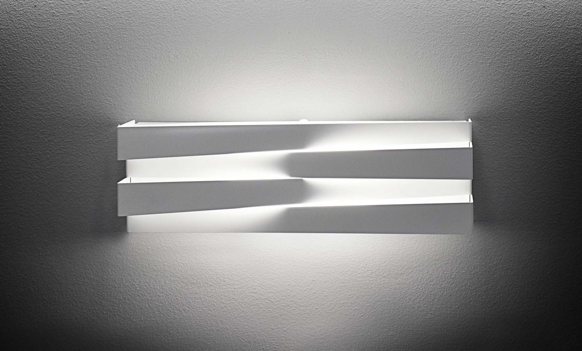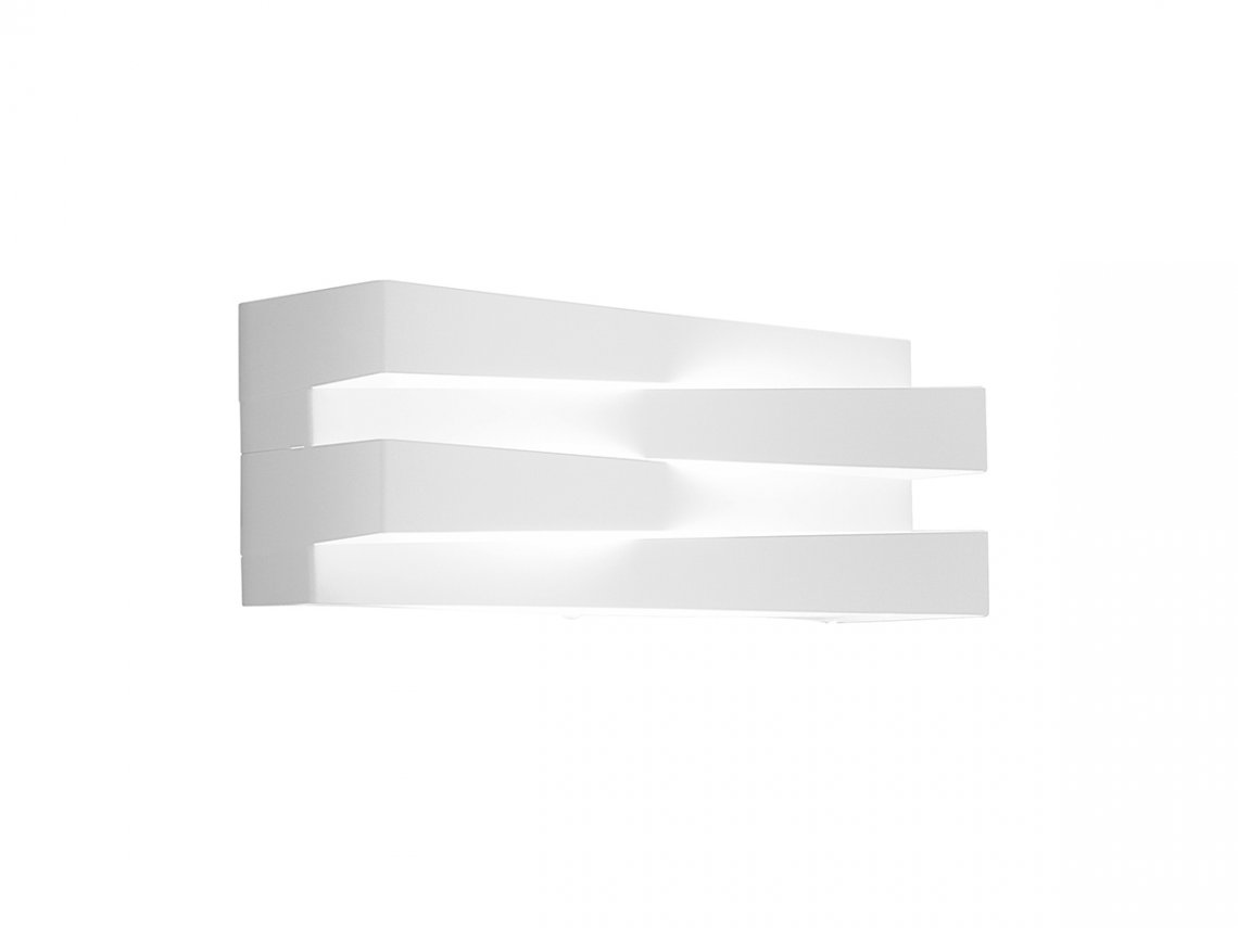 Wall lamp in laser-cut metal and glass diffuser. Direct and indirect LED light. Metal cover in white or mat brass polyacrylic paint or hand-decorated with golden leaf and fixed without any visible screw thanks to an elastic system. The assembled covers create a symmetrical play of lights and shadows on the structure. Ideal for corridors or residential use.