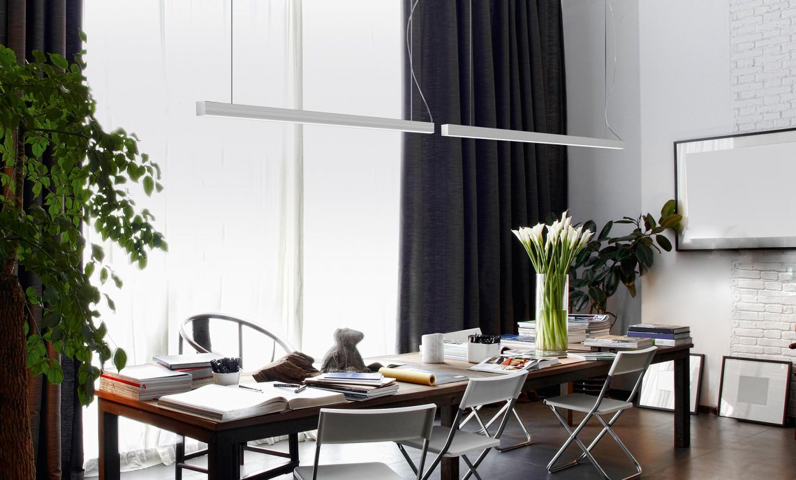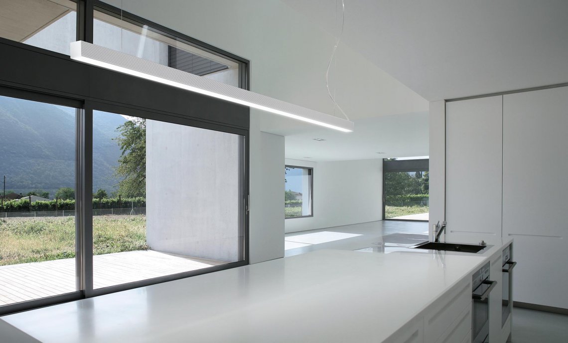 Suspension LED in extruded aluminium, painted white, black with reflector and screen.