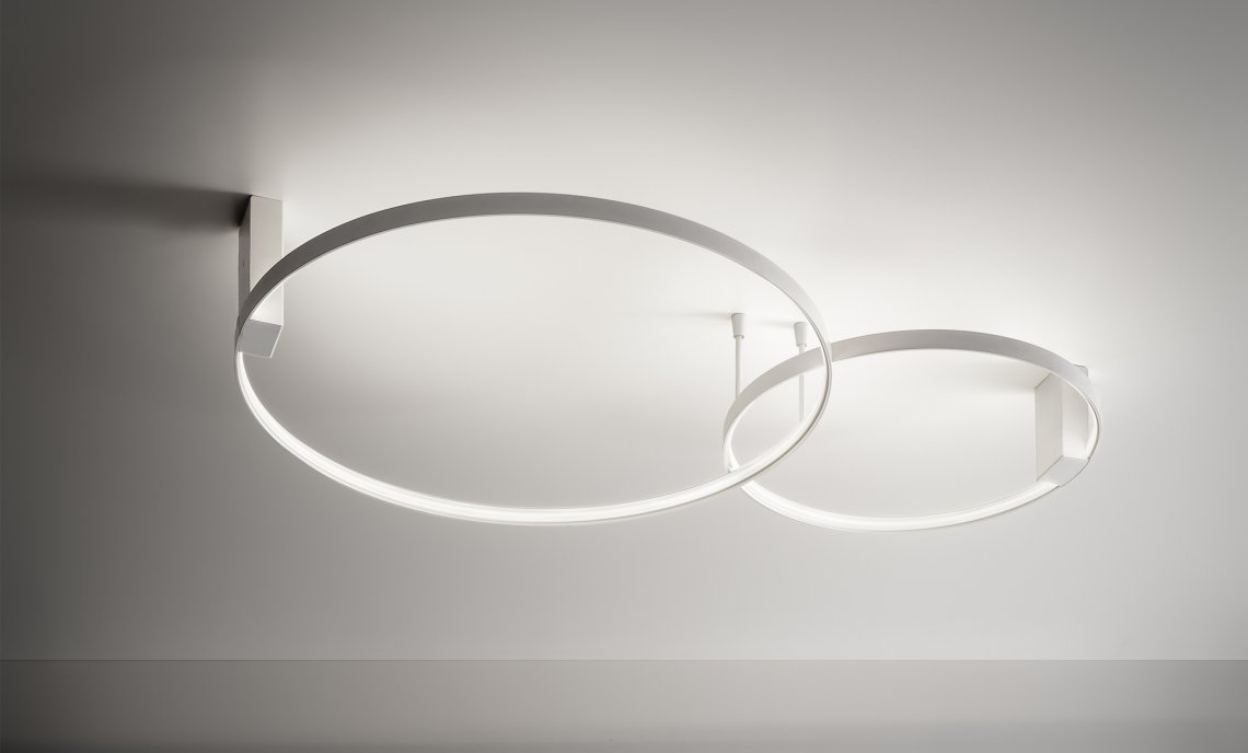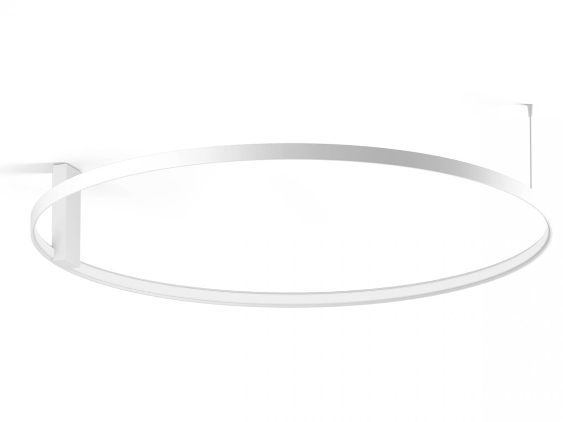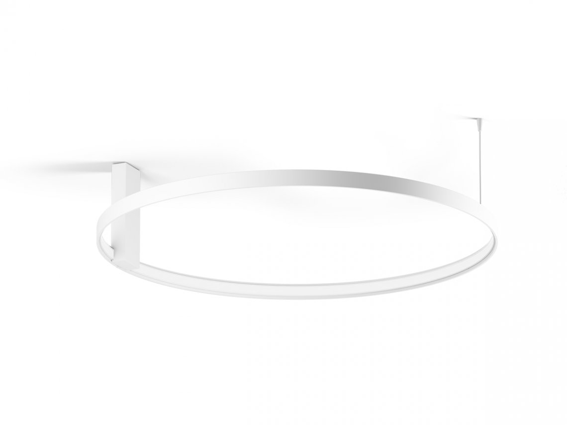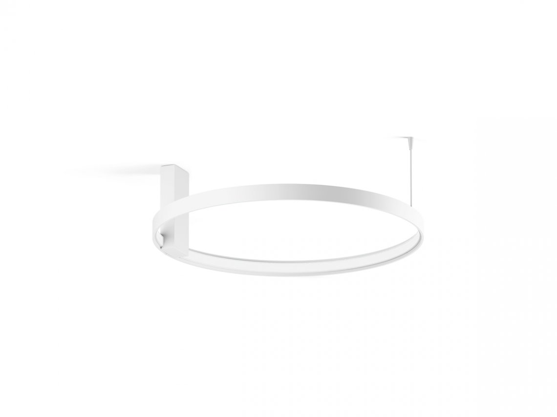 Horizontal suspension lamp, wall and ceiling lamp in extruded curved aluminum, with opal polycarbonate screen. Emission on the internal side provided by LED modules with technology DALI/Push DIM integrated into the canopy. Polyacrilic paint white, black, titanium, bronze and mat brass finishes are available. Canopies for single and multiple configurations with Zero Ellipse and and Zero Square are available, to be ordered separately. Ideal for offices, halls, living, and public spaces, also combinated with Zero Round Acoustic and Arena Acoustic.